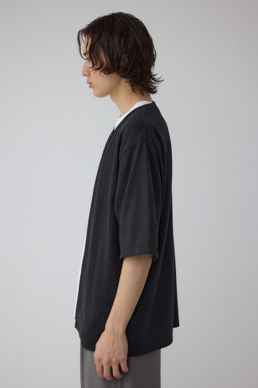 Комплект включает в себя куртку с текстурой, напоминающей ивовую лозу, и футболку с одноточечным логотипом.