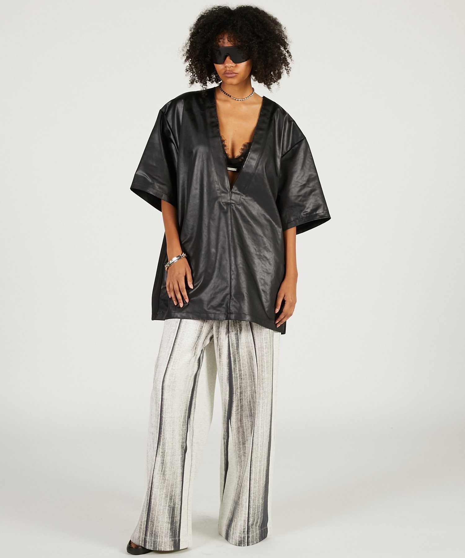 Футболка оверсайз из искусственной кожи с глубоким V-образным вырезом для современного образа. Хорошо сочетается с многослойными нарядами, такими как рубашки и кружевные майки, а также с брюками, например, чиносами.