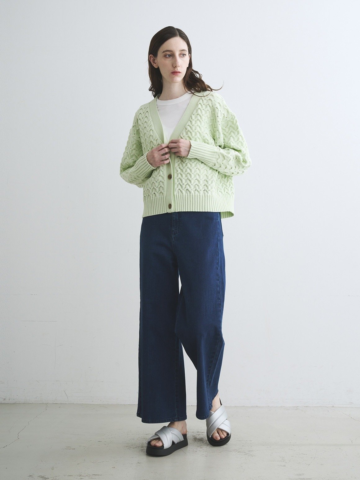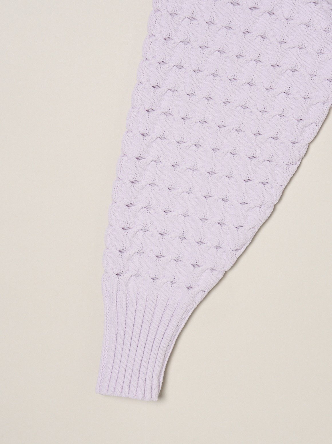 Толстая пряжа связана в виде сетчатого узора с косами, что создает эффектный результат. Яркий, чистый красный цвет добавляет изюминку к нежной весенней цветовой палитре.