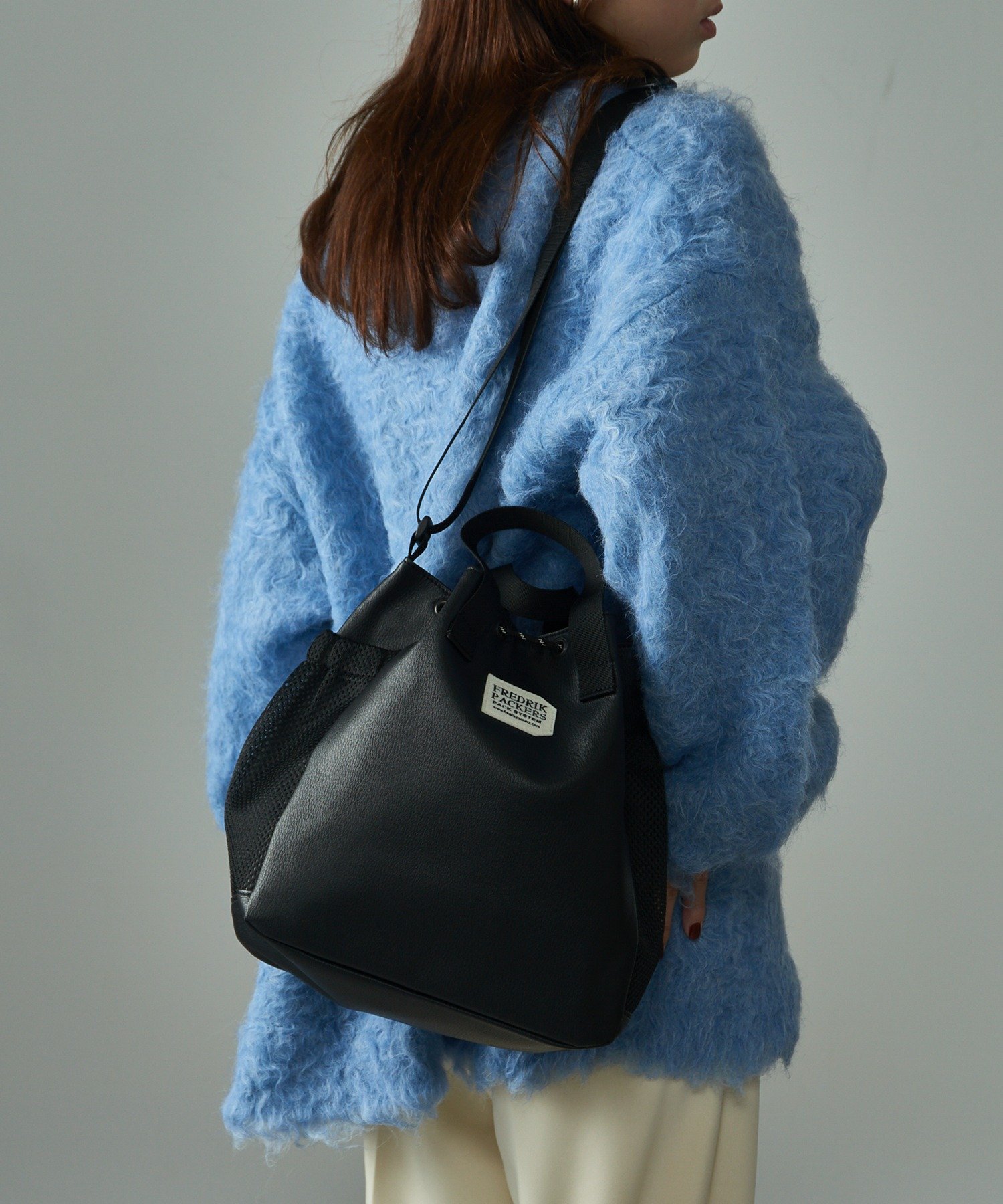Детали・Изысканное сочетание искусственной кожи и сетки в полностью черном цвете создает утонченное впечатление. ・Двусторонний дизайн, который можно использовать как сумку или как сумку через плечо! ・Достаточно вместительная, чтобы поместить повседневные вещи, такие как длинный кошелек и бутылка воды◎