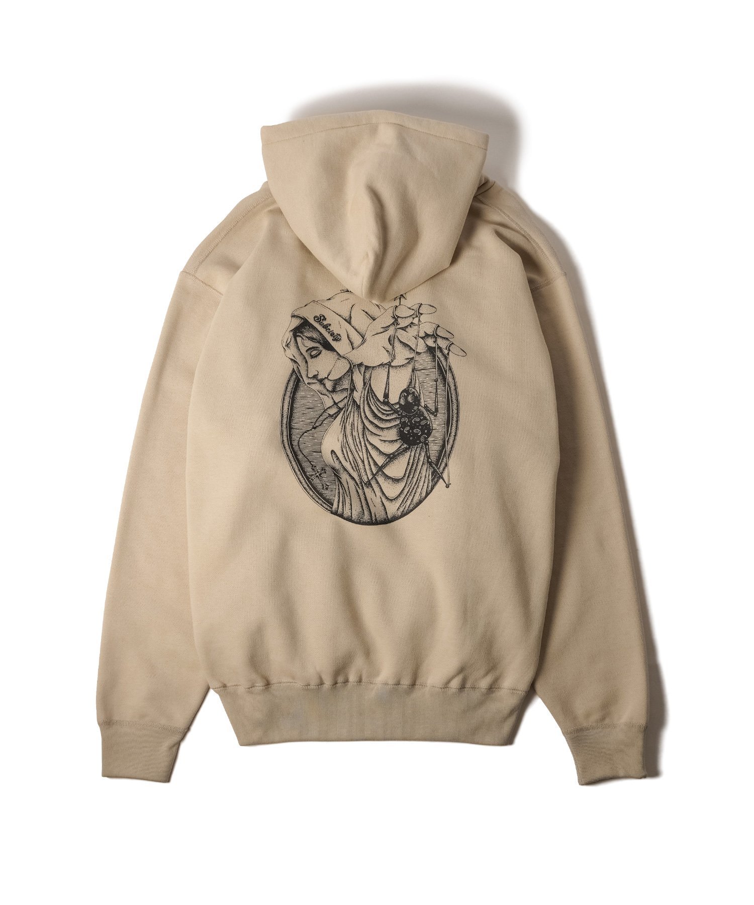 Логотип бренда ярко напечатан на левой стороне груди, а на спине — изображение Марии, управляющей куклой, выполненное в технике пуантилизма.