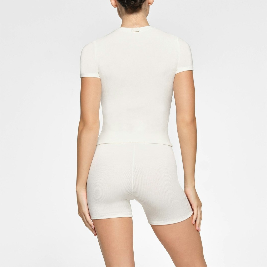 Главное преимущество этой футболки — ее идеальная базовая природа. Мягкая ребристая ткань из 95% хлопка дарит коже комфорт и прохладу, а облегающий крой подчеркивает фигуру, создавая аккуратный и женственный силуэт. Это та самая футболка, которую вы будете надевать чаще всего, потому что она подходит ко всему и всегда выглядит безупречно. Минимализм, качество и универсальность — вот что делает эту вещь незаменимой.