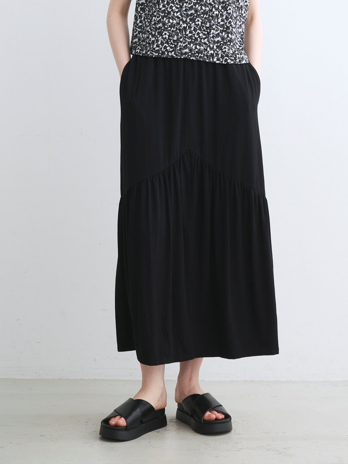 Юбка украшена сборками, ниспадающими от изогнутого шва. Они добавляют элегантности простому топу, что делает ее отличным выбором для сочетания с классической футболкой. Сборки создают мягкий силуэт, благодаря чему платье легко носить, не подчеркивая фигуру.