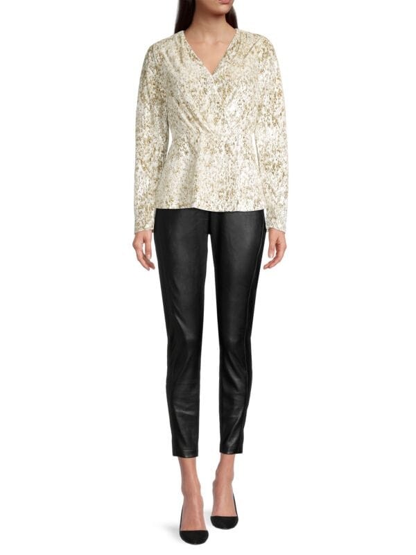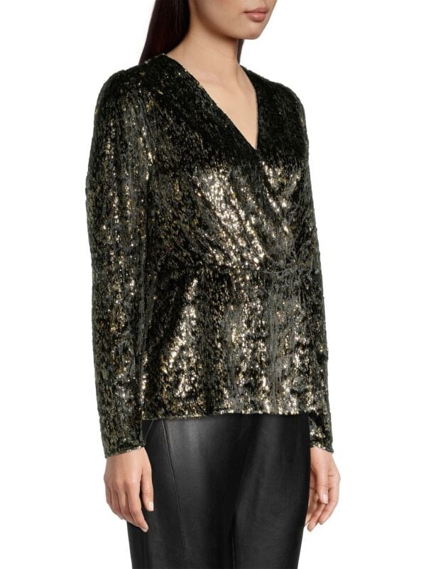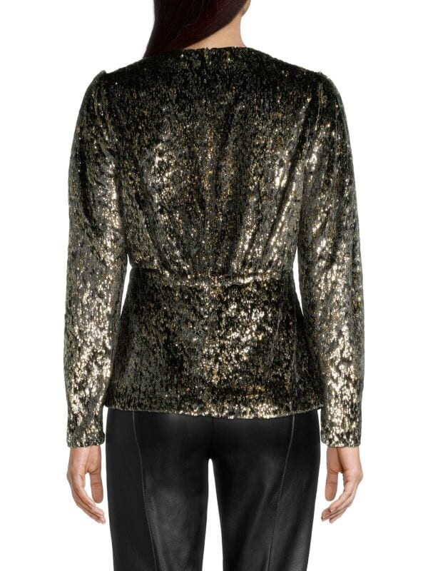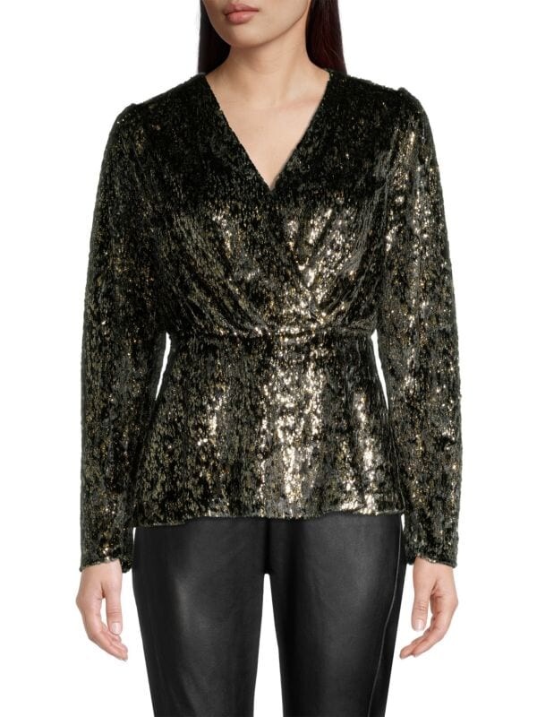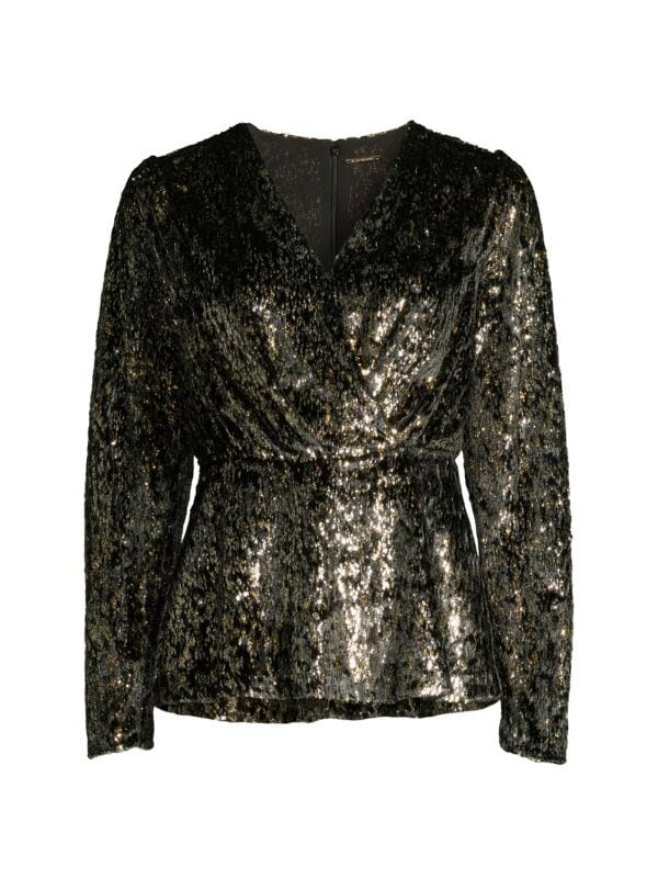 Этот топ с баской с запахом спереди и блестящими пайетками.V-образный вырез.Длинные рукава.Застежка-молния сзади. 38 % вискоза/34 % полиэстер/28 % вискоза.Ручная стирка.Импорт.