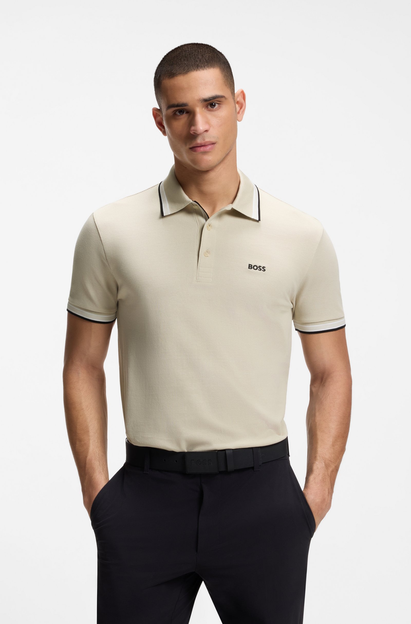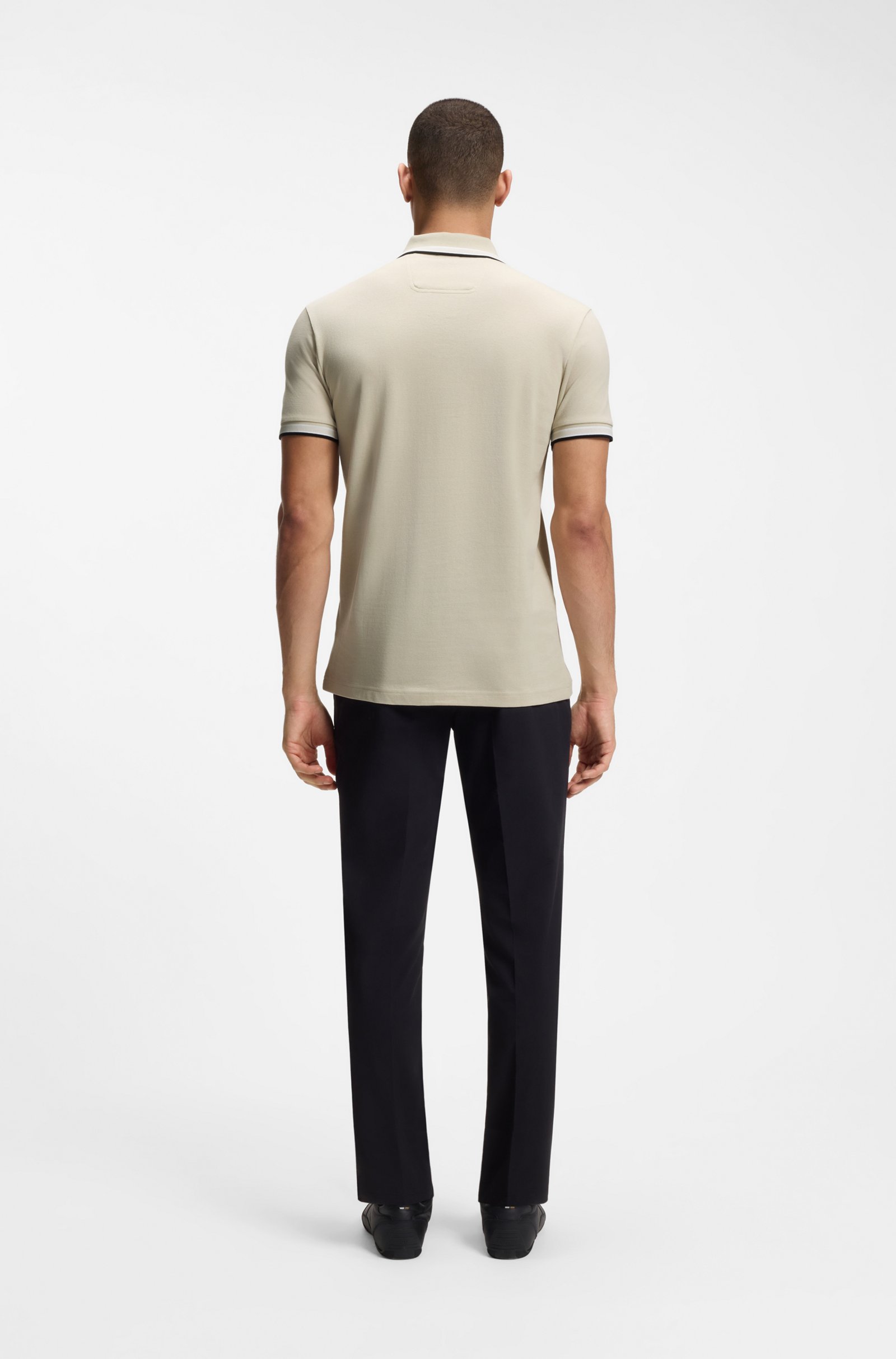 Контрастный логотип и спортивные полосатые детали придают поло узнаваемый статусный штрих и динамичный характер, не нарушая его лаконичной элегантности. Эти элементы подчеркивают принадлежность к премиальному бренду и добавляют изделию выразительности.