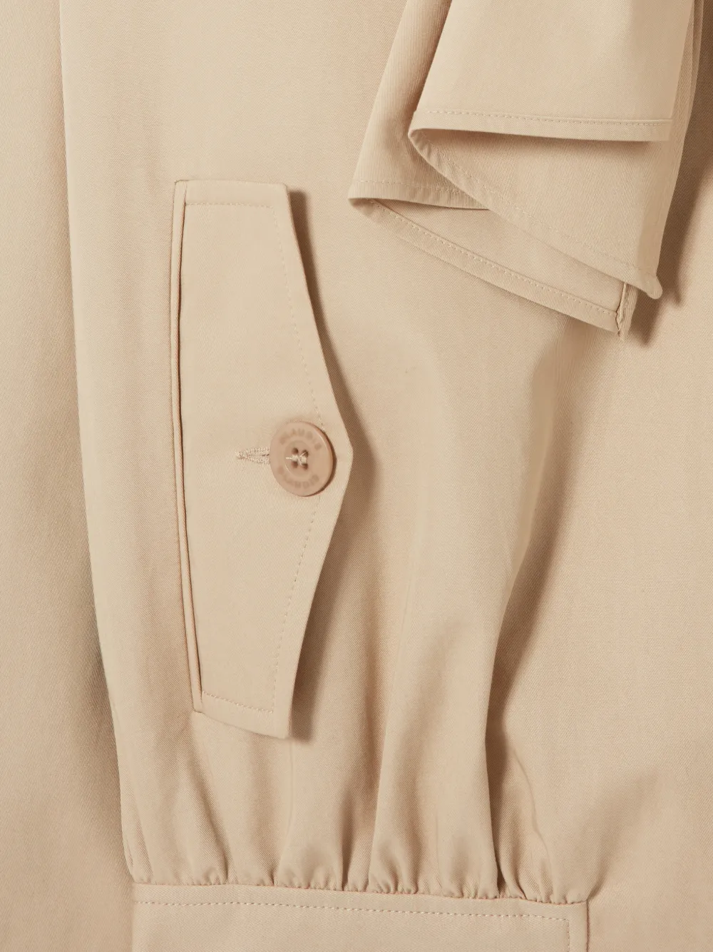 Бежевый хлопок, застежка на пуговицы, накладные карманы с клапанами спереди, бантовый декор, застежка на пуговицы, эластичный низ