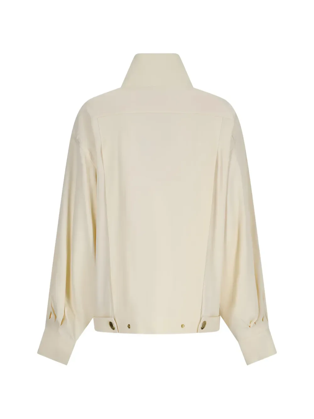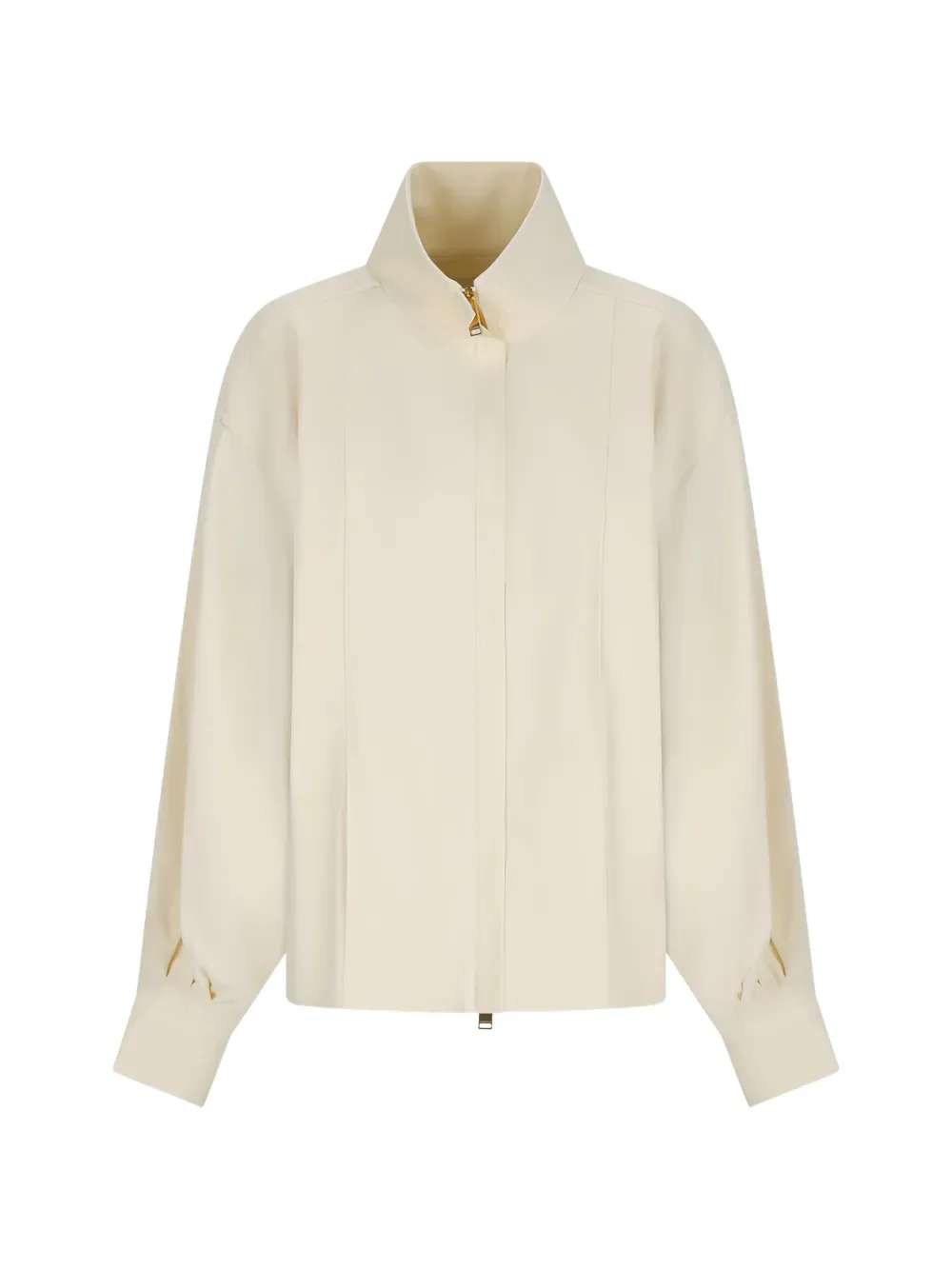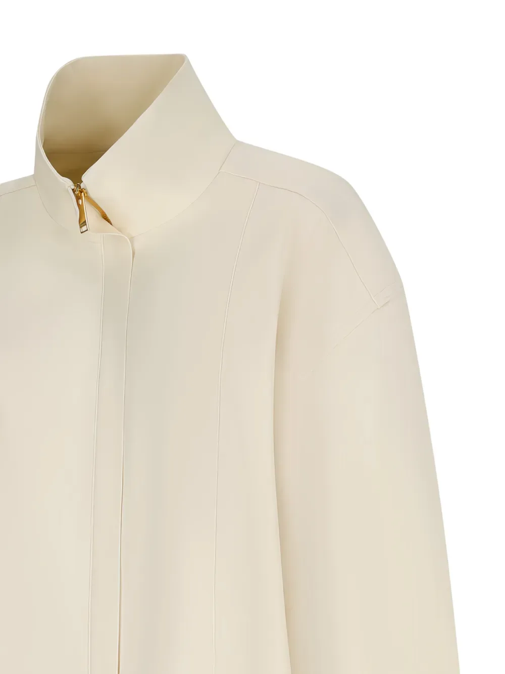 Высокий воротник, длинные рукава, скрытая застежка-молния спереди, цвет - молочный (off-white).