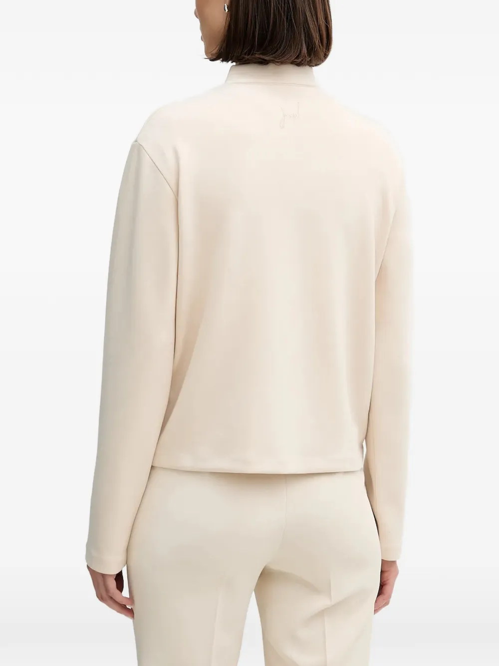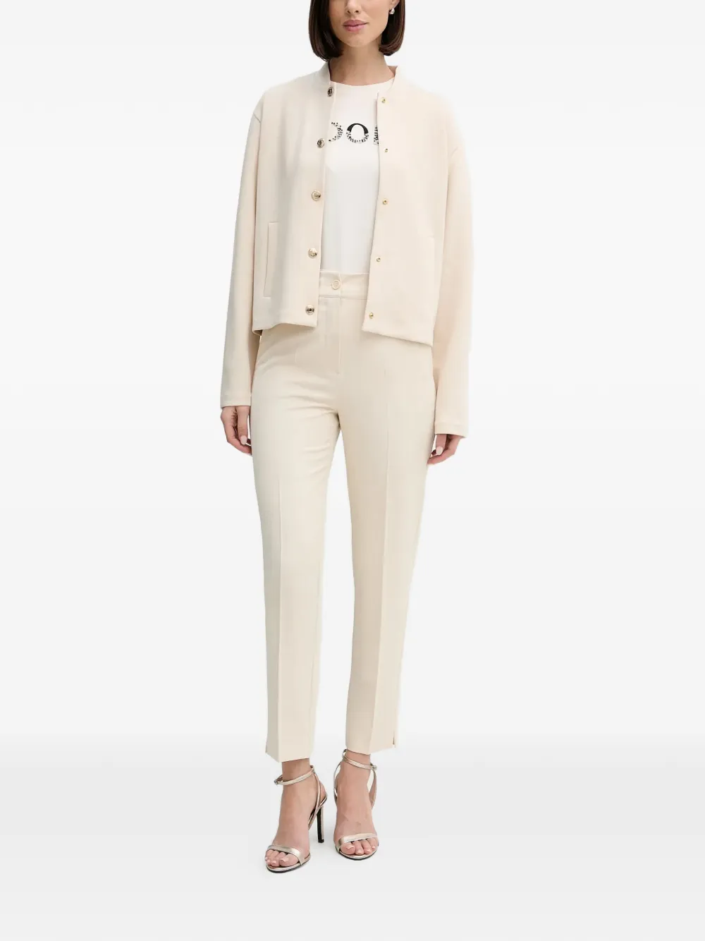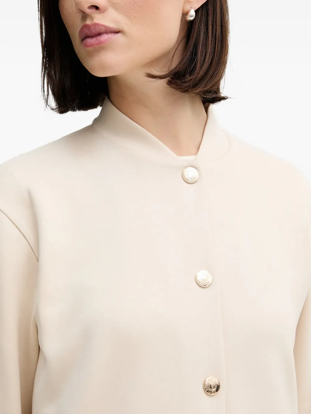 Кремовый, золотистые пуговицы, круглый вырез, длинные рукава, боковые карманы, укороченный