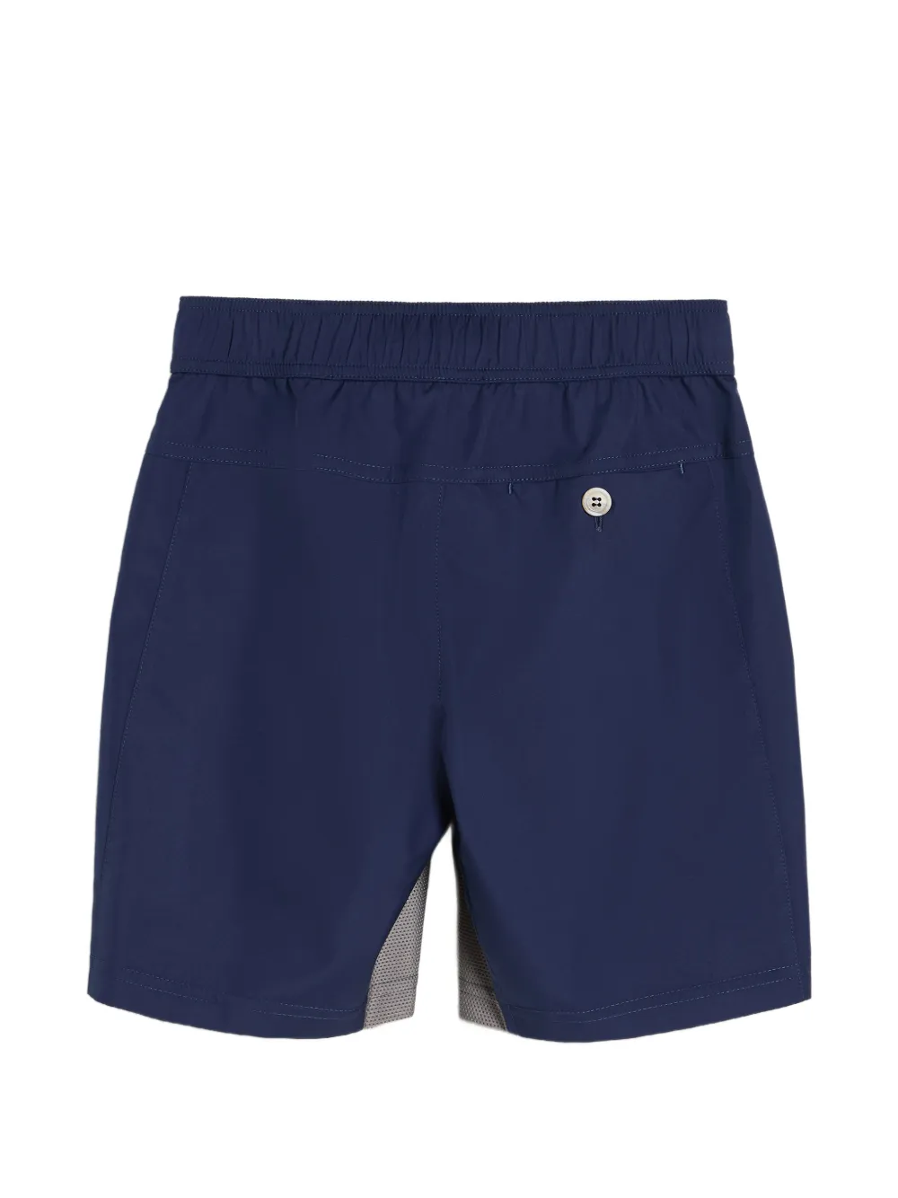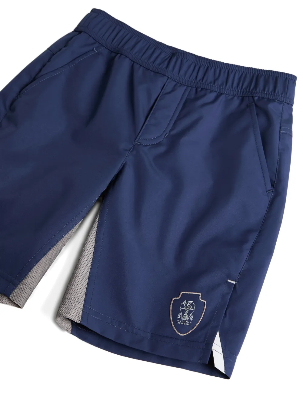 Спортивная, но элегантная атмосфера мира тенниса вдохновляет коллекцию, которая дополняет весенне-летнюю линейку. Спортивный стиль и универсальные материалы придают этим шортам-бермудам из нейлона непринужденный вид. Легкая, не подбитая подкладкой конструкция обеспечивает свободный, удобный силуэт, а пояс на резинке делает модель практичной и функциональной. Гербовый логотип внизу добавляет контрастный акцент цвета. Синие брюки с эластичной талией, передними карманами и задним прорезным карманом на пуговице. В соответствии с философией компании, все изделия из детской коллекции изготавливаются с особым вниманием к подбору материалов и деталей.