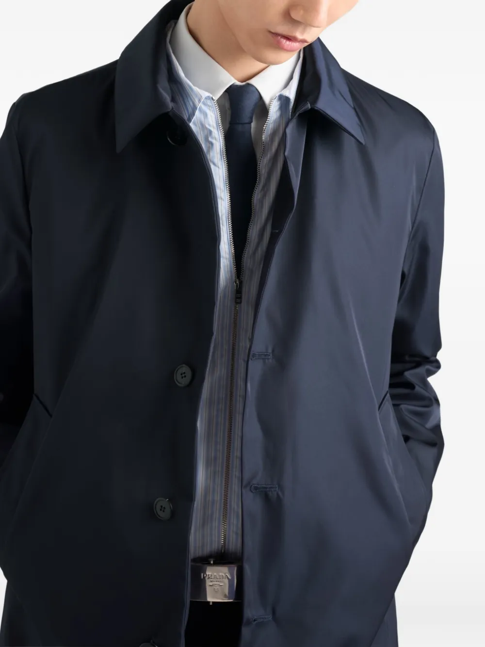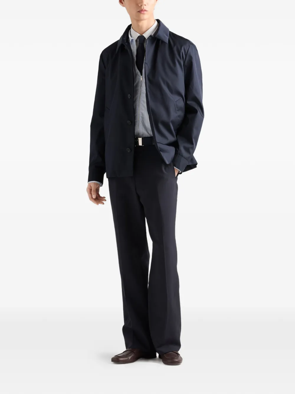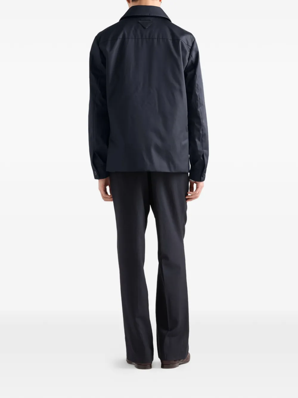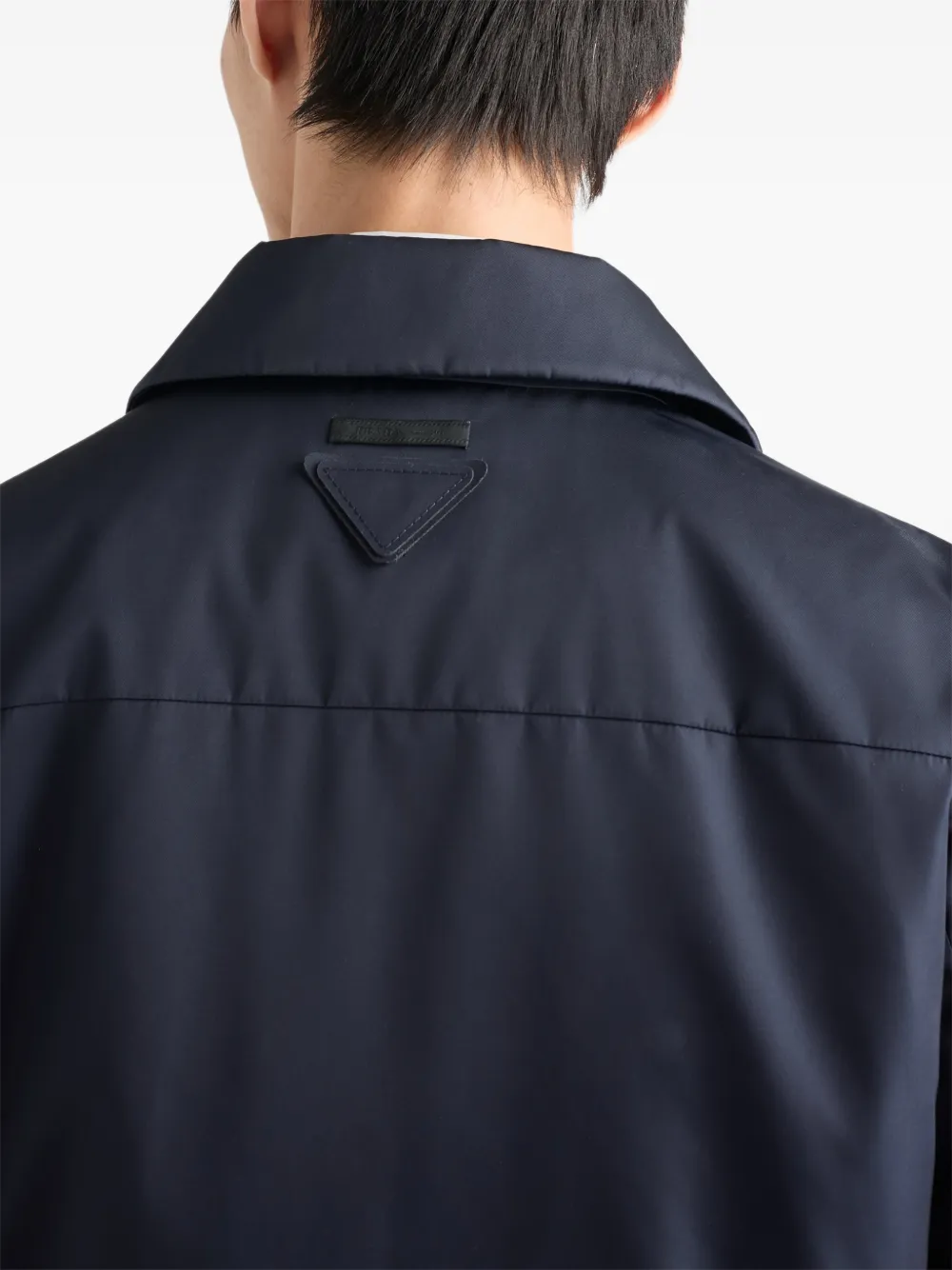 Эта куртка-блузон прямого кроя выполнена с воротником-рубашкой и прямыми рукавами, что придает образу изысканность. Модель изготовлена из инновационной ткани Re-Nylon, полученной из переработанных пластиковых материалов, собранных в океане, и может быть переработана бесконечно много раз. Тканевый треугольный логотип - узнаваемый символ коллекций Prada - украшает изделие.