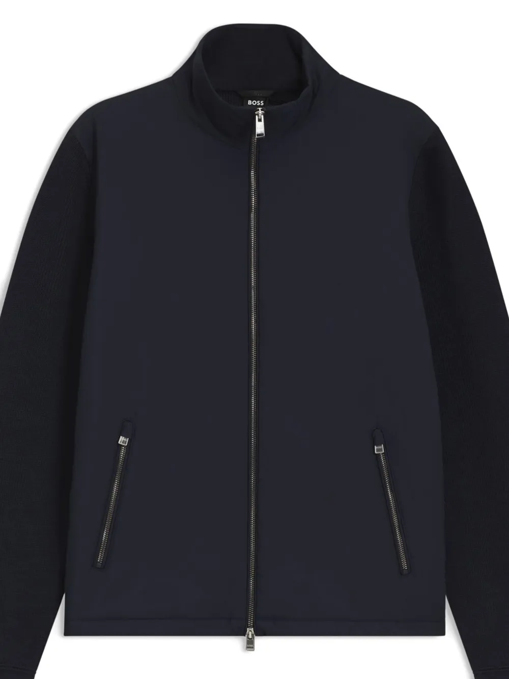 Темно-синие вязаные рукава, застежка-молния, прорезные карманы на молнии, воротник-стойка, прямой подол