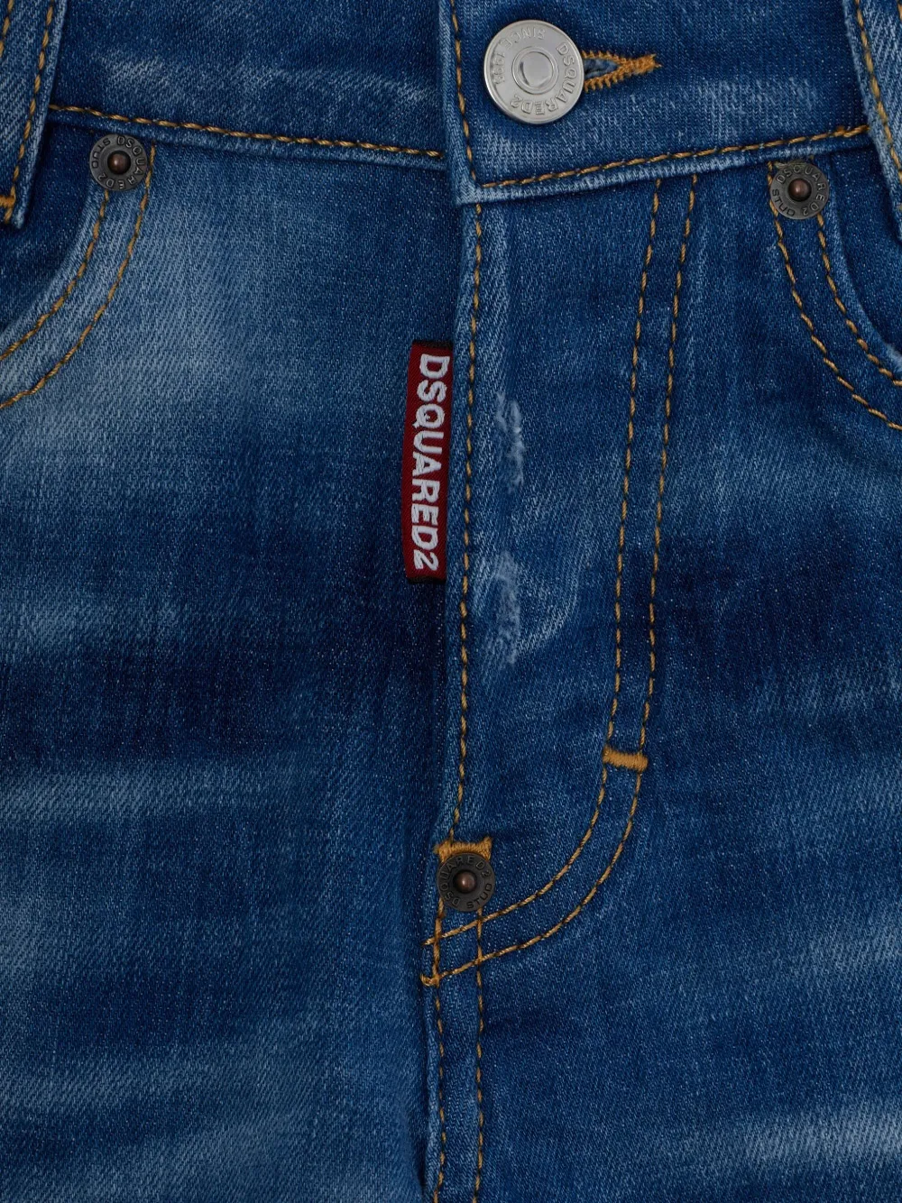 Синий цвет, потертые детали, пять карманов, шлевки для ремня, нашивка с логотипом, застежка на пуговицу