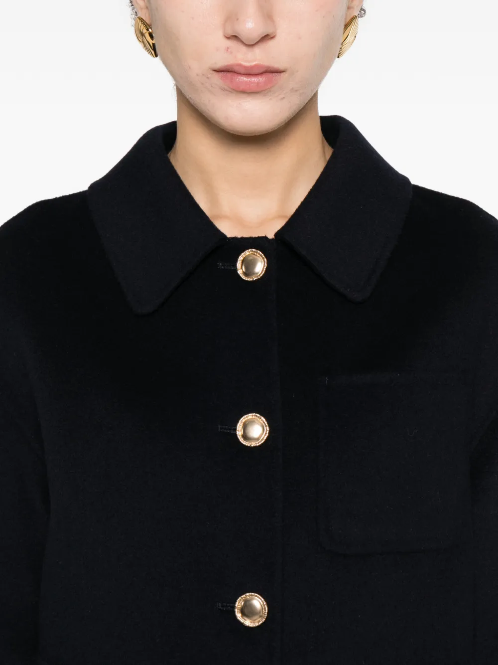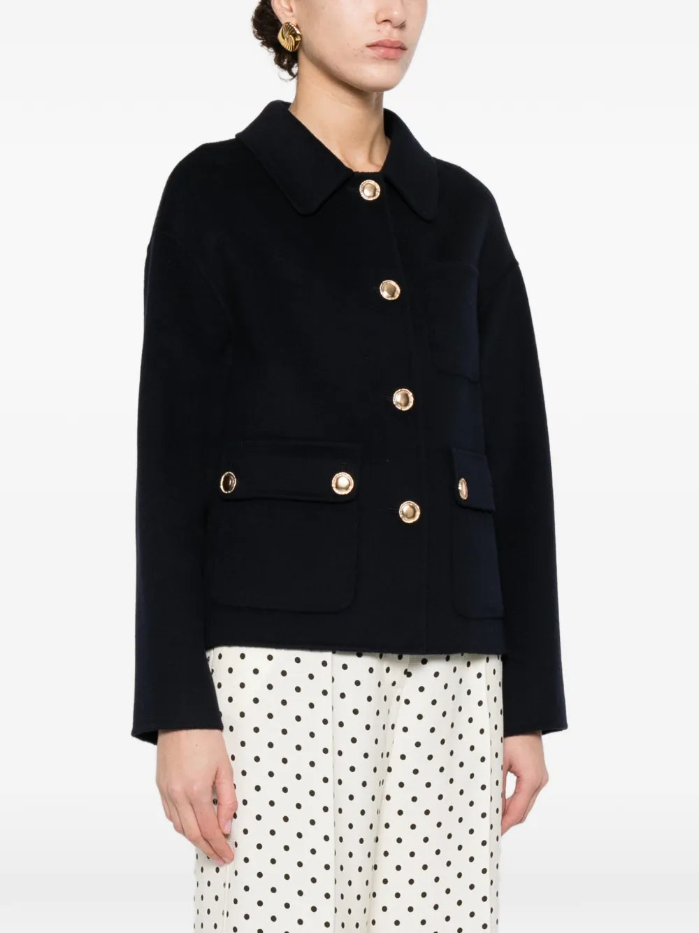 Ночной синий, фурнитура золотистого цвета, накладные карманы, застежка на пуговицы, отложной воротник, длинные рукава