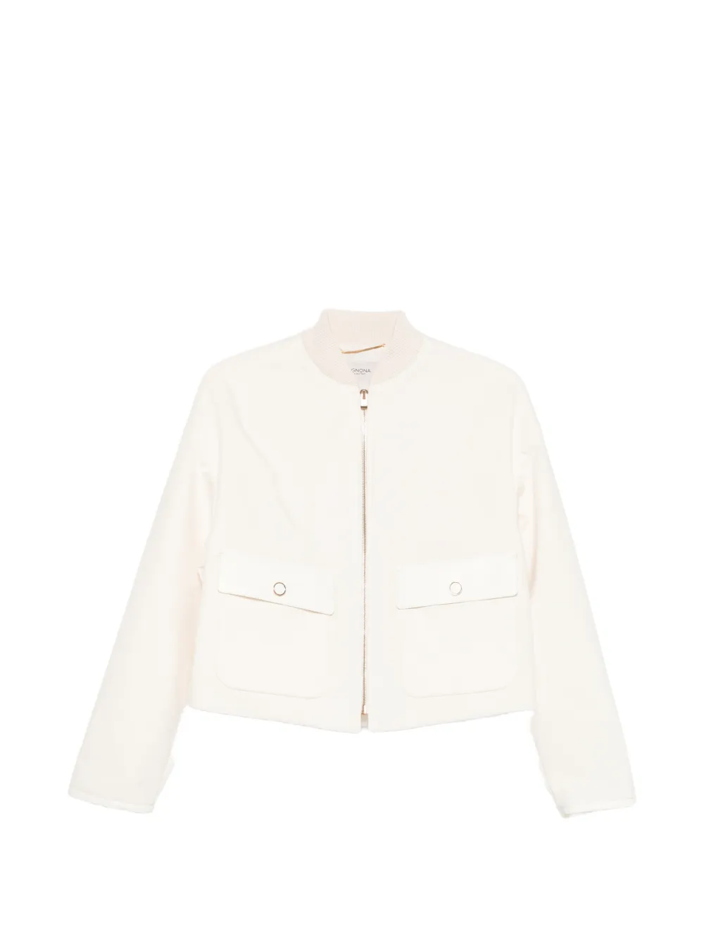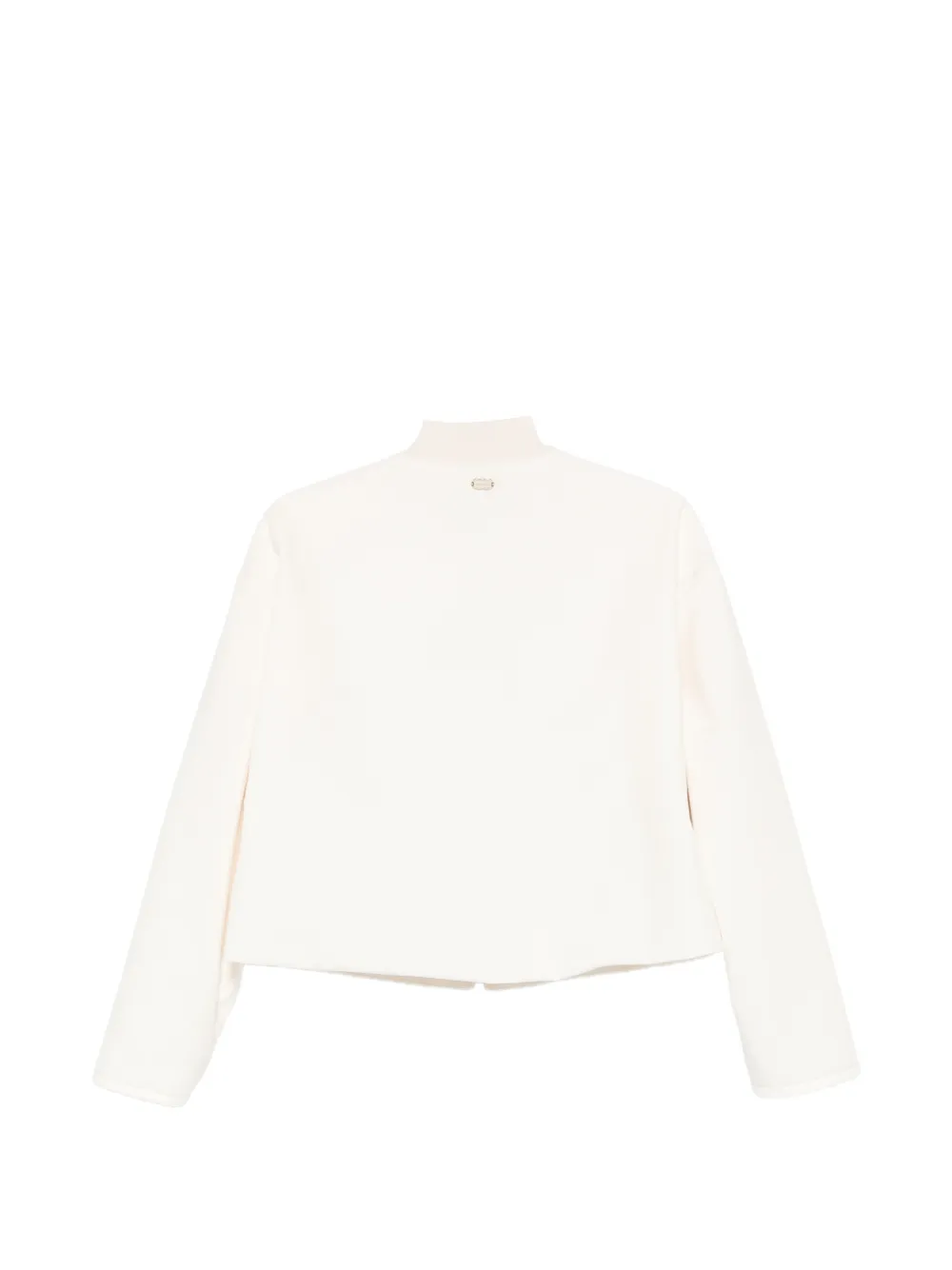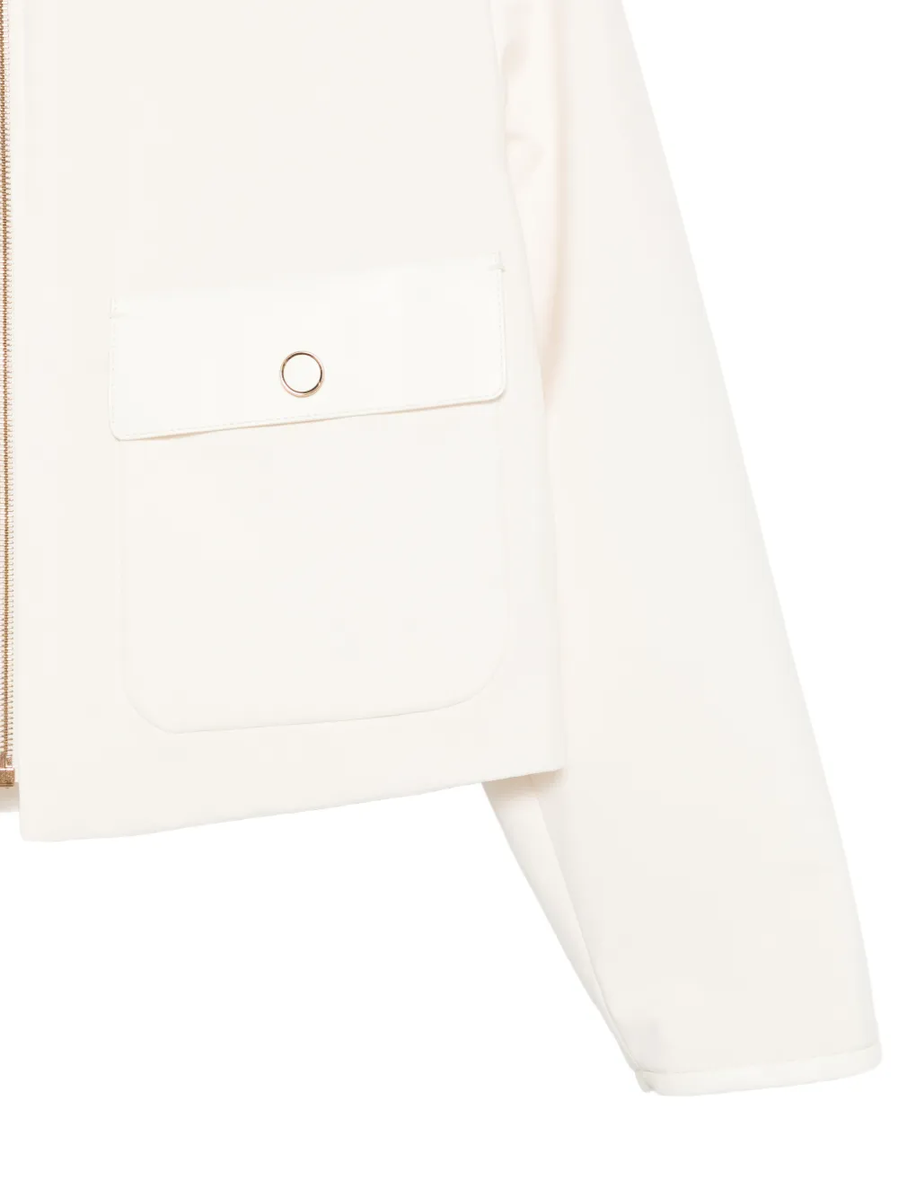 Молочно-белый, застежка-молния спереди, круглый вырез, накладные карманы с клапанами, отделка пуговицами
