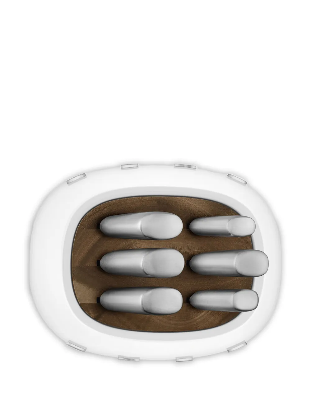 Белый деревянный интерьер, шесть слотов, округлая форма, логотип и надпись, в комплекте 6 эксклюзивных ножей: нож шеф-повара, нож для хлеба, нож сантоку, нож для нарезки, универсальный нож и нож для овощей. Пожалуйста, обратитесь к вкладке "Размер и посадка", чтобы узнать больше о размерах этого товара.