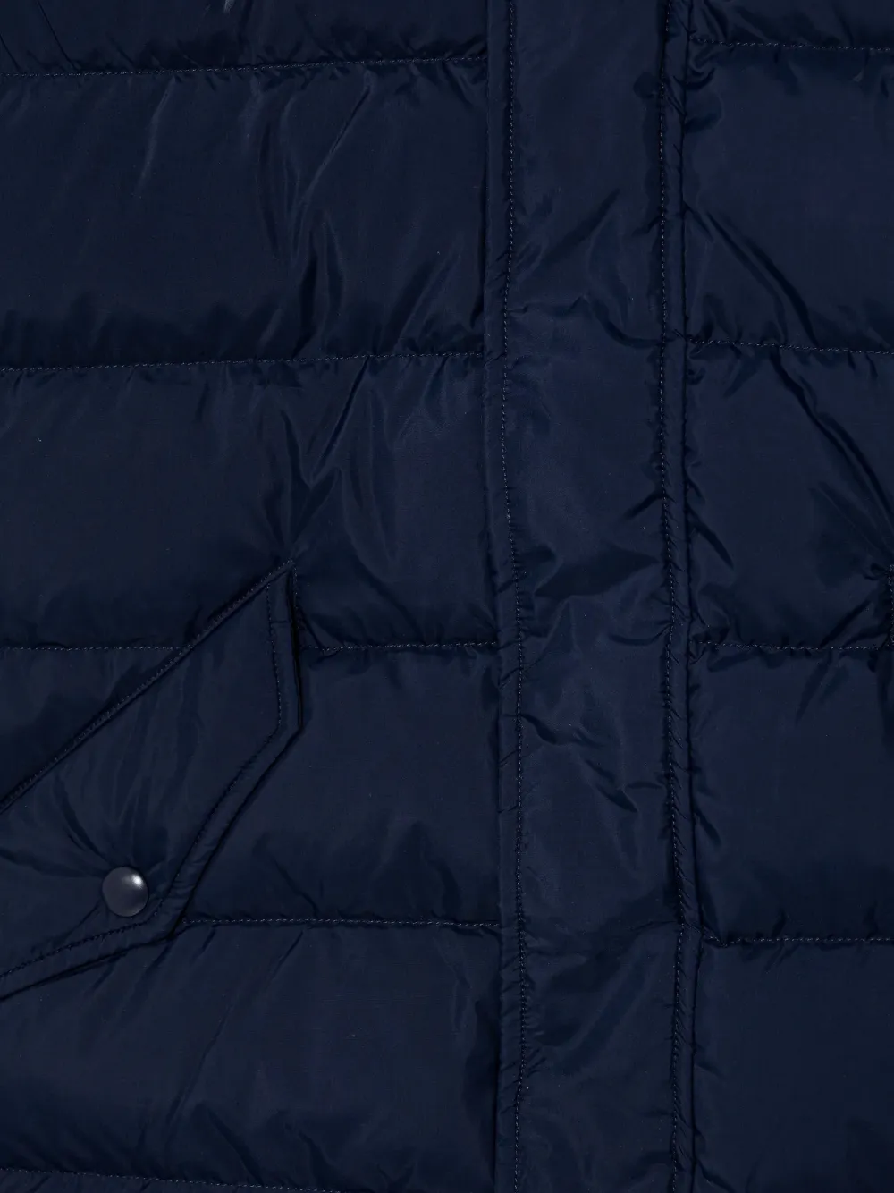 Темно-синий стеганый (пуховик/куртка) с отстегивающимся капюшоном, накладными карманами с клапанами, длинными рукавами, застежкой на молнию