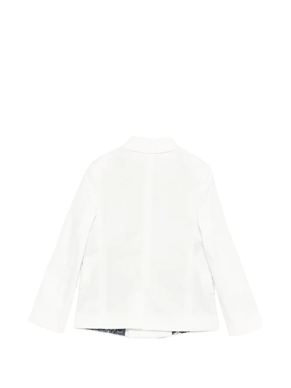 Белый двубортный жакет на пуговицах с цветочной подкладкой, клапанами на карманах и логотипом