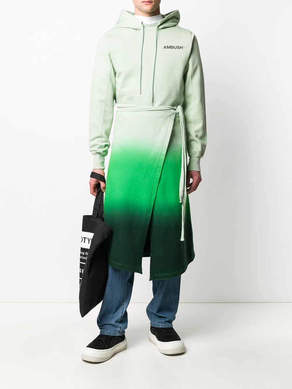 Платье с капюшоном от AMBUSH. Капюшон, затягивающийся на шнурок, круглый вырез под горло в рубчик, логотип на груди, талия на завязке, перед с запахом, тонально-градиентный эффект, асимметричный подол и средней длины. Цвет: зеленый.