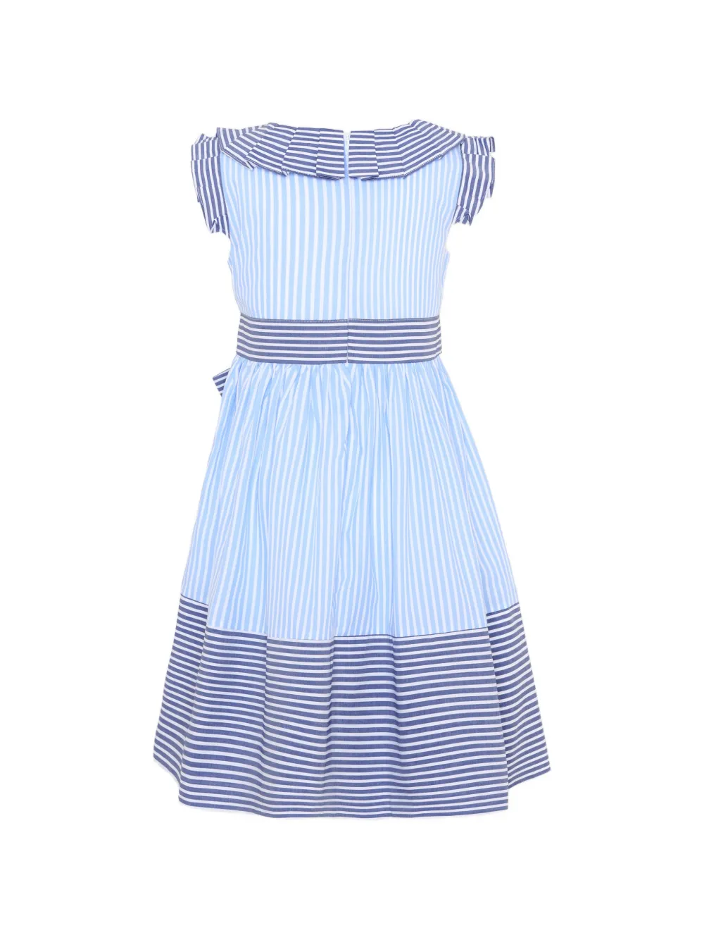 Синий/белый полосатый узор, оборчатый воротник, застежка на пуговицы спереди, пояс на завязке, рукава-крылышки, силуэт "А-силуэт"