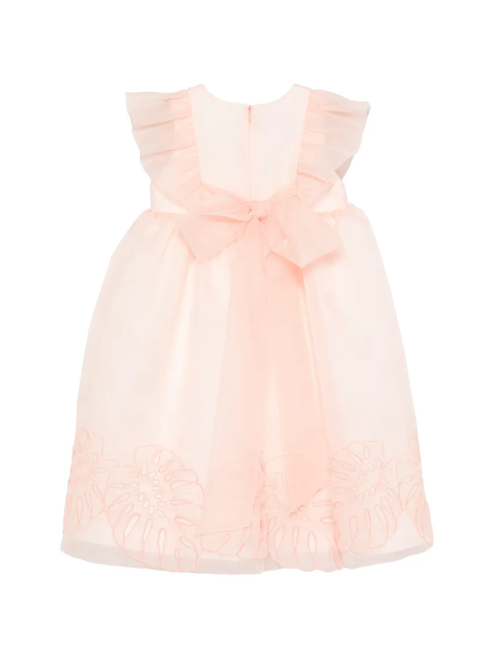 Солнечно-розовый цвет, цветочная вышивка, оборчатые детали, детали с бантом, короткие рукава-крылышки, застежка-молния сзади