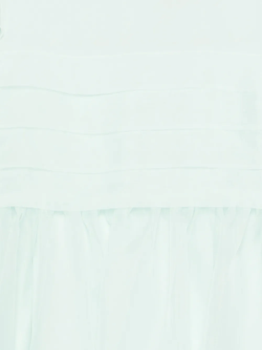 Бледно-зеленый цвет, рукава с рюшами, плиссированная отделка, застежка на пуговицы сзади, круглый вырез