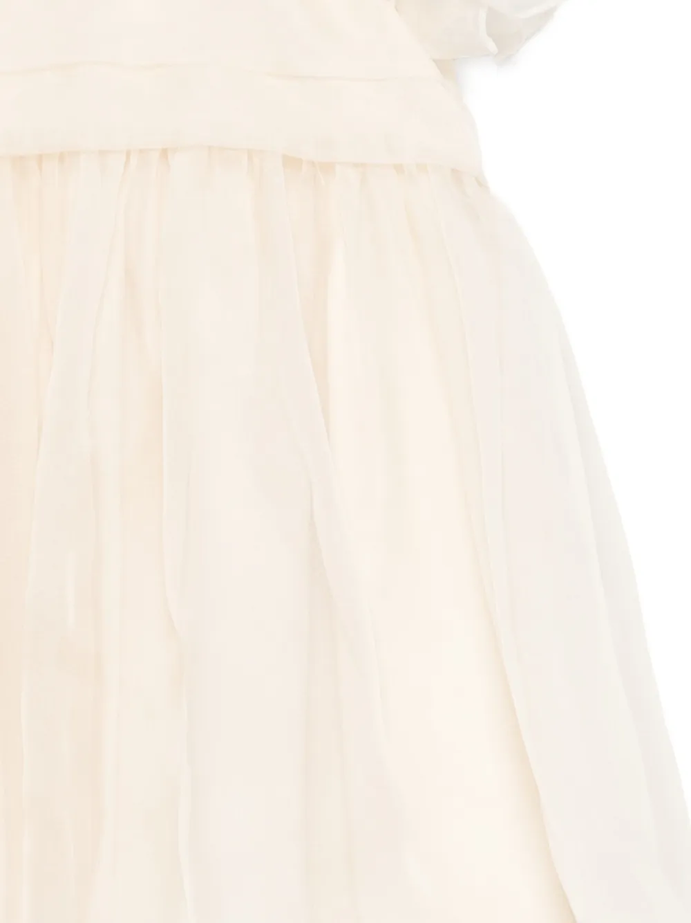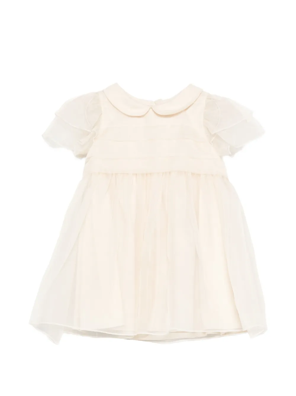 Бежевое платье с многослойными оборками на коротких рукавах, воротником Питер Пэн и присборенной юбкой