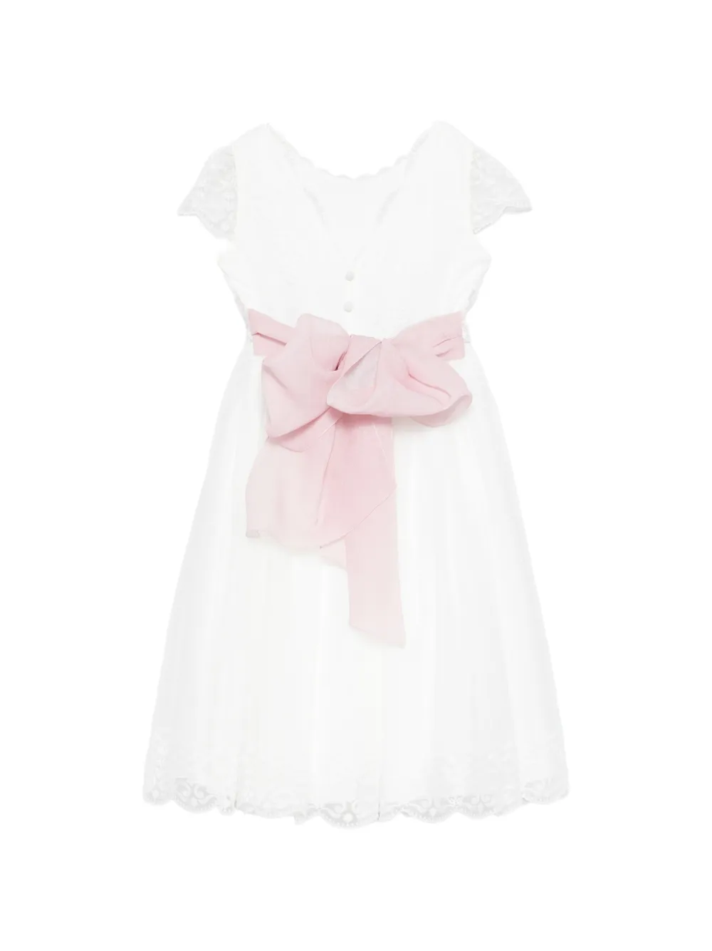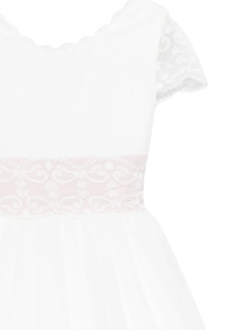 Кремовая юбка А-силуэта с кружевной отделкой, короткими рукавами и бантом