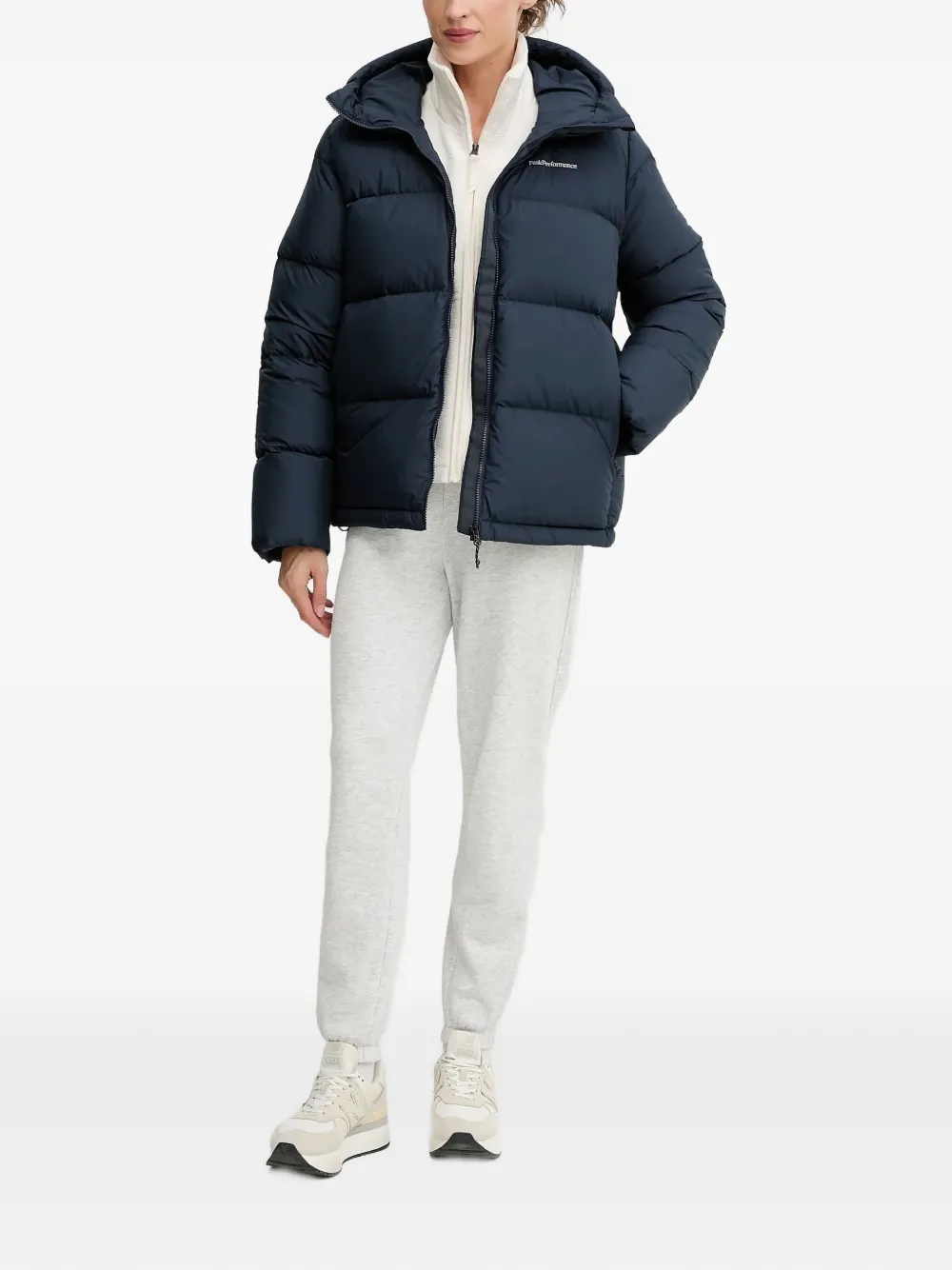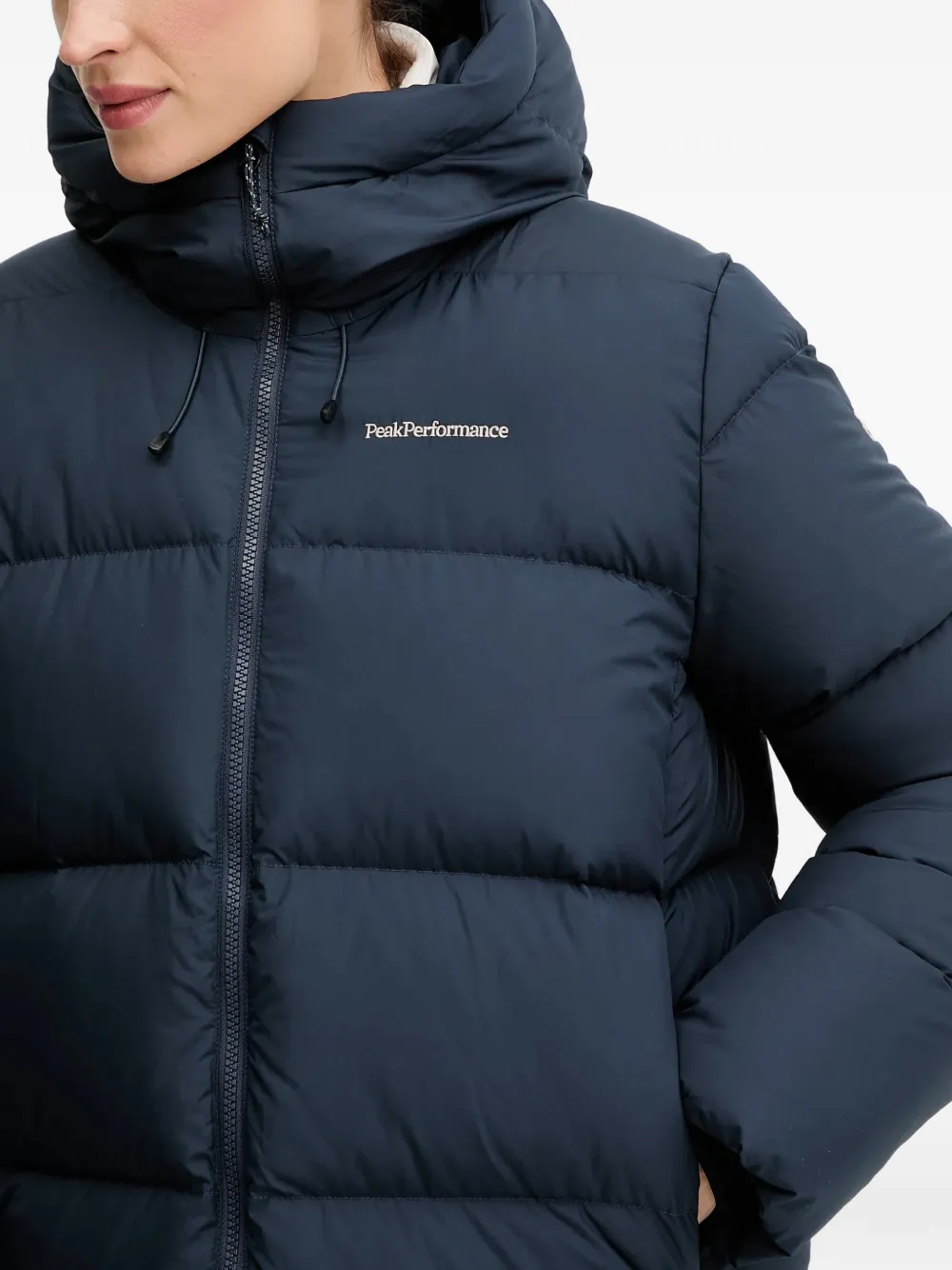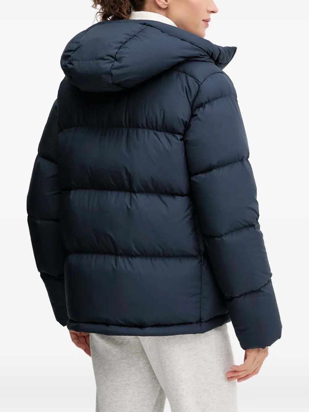 Темно-синяя куртка-пуховик с капюшоном, застежкой на молнию спереди, логотипом и боковыми карманами