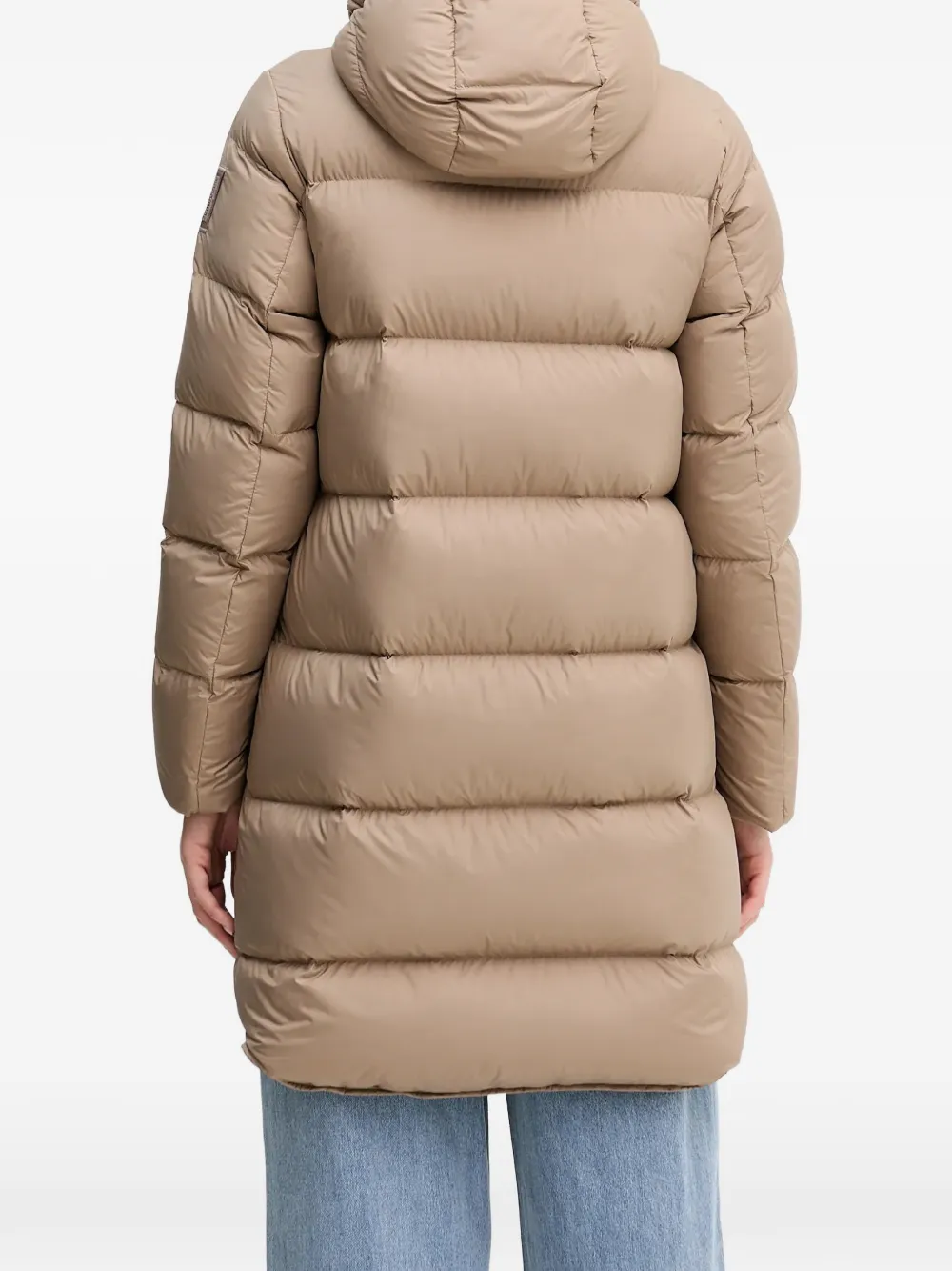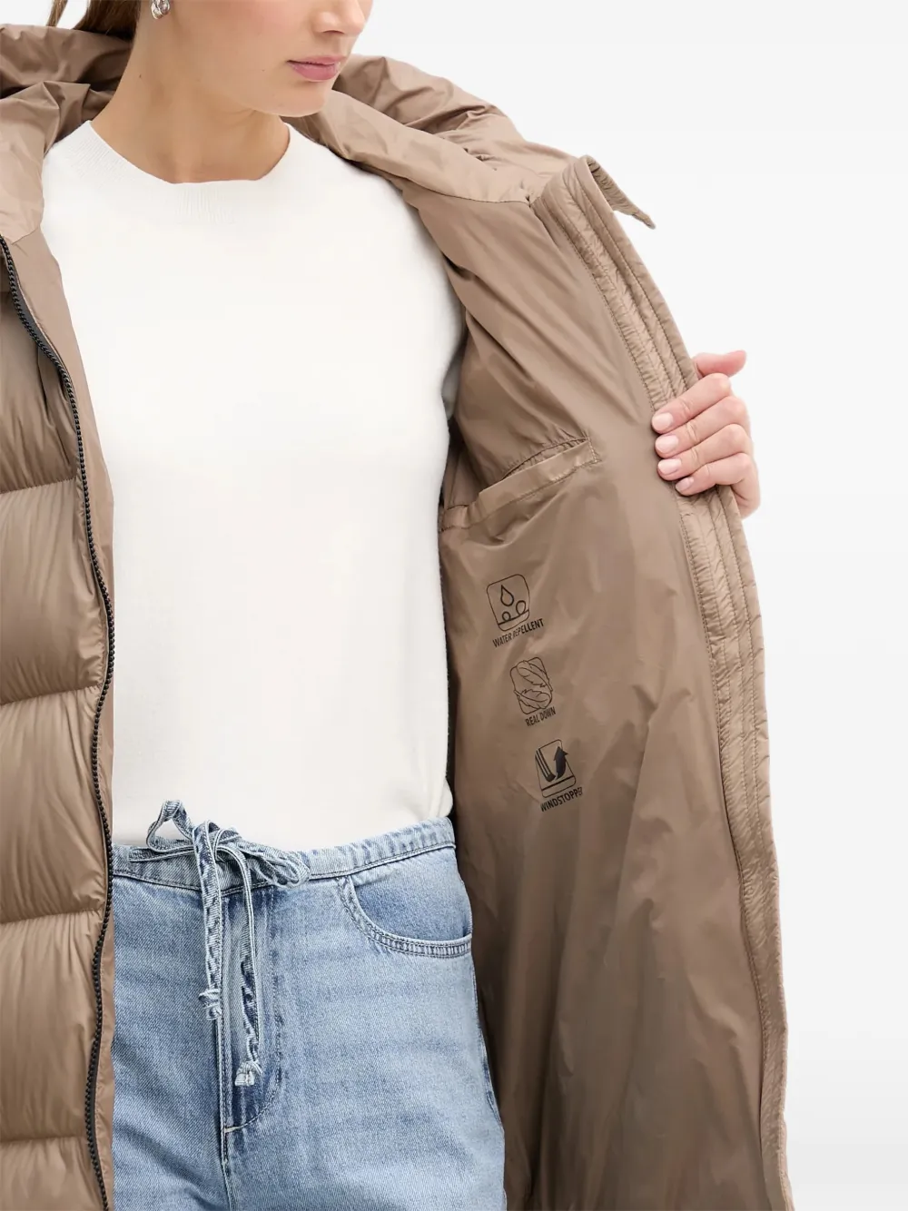 Коричневый пуховик с капюшоном, застежкой на молнию, нашивкой-логотипом и прорезными карманами