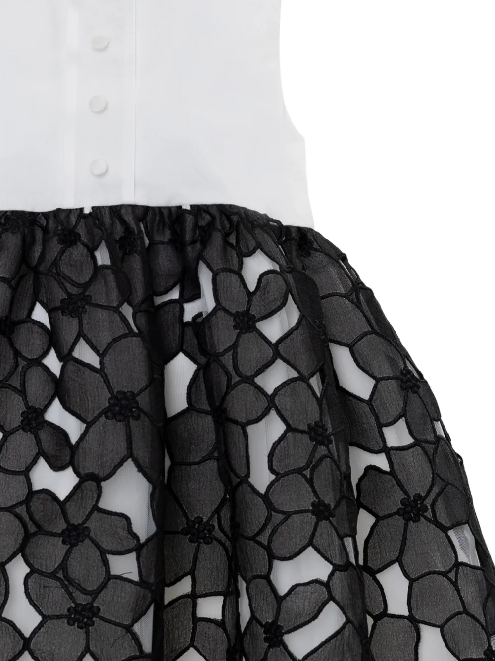 Белый топ без рукавов с цветочными аппликациями, воротником, застежкой на пуговицы и фигурной отделкой