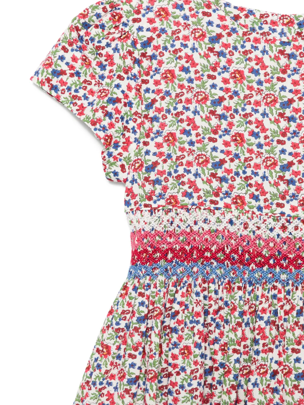 Красно-синий цветочный принт, бант, короткие рукава, собранная талия, застежка на пуговицы сзади