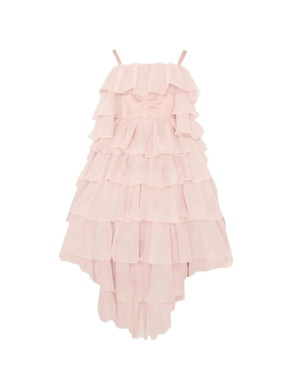 Розовое платье без рукавов с цветочными деталями, оборками и асимметричным подолом