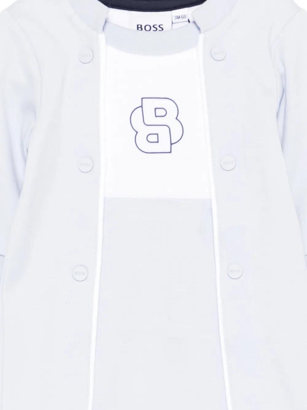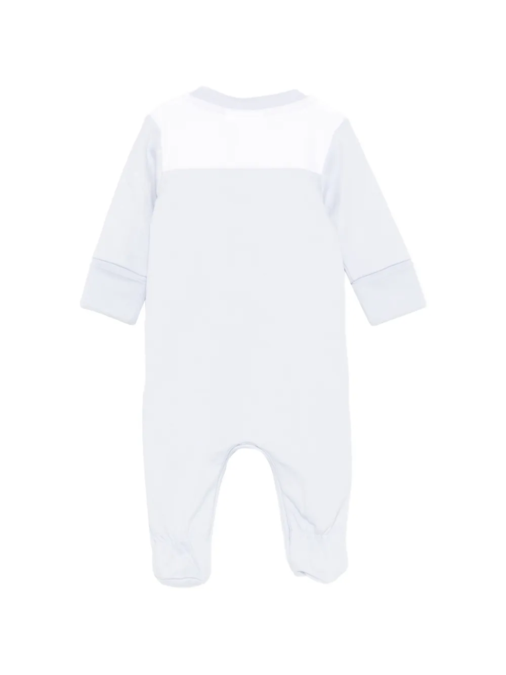 Синий комбинезон с принтом логотипа, круглым вырезом, длинными рукавами, застежкой на кнопки и закрытыми ножками