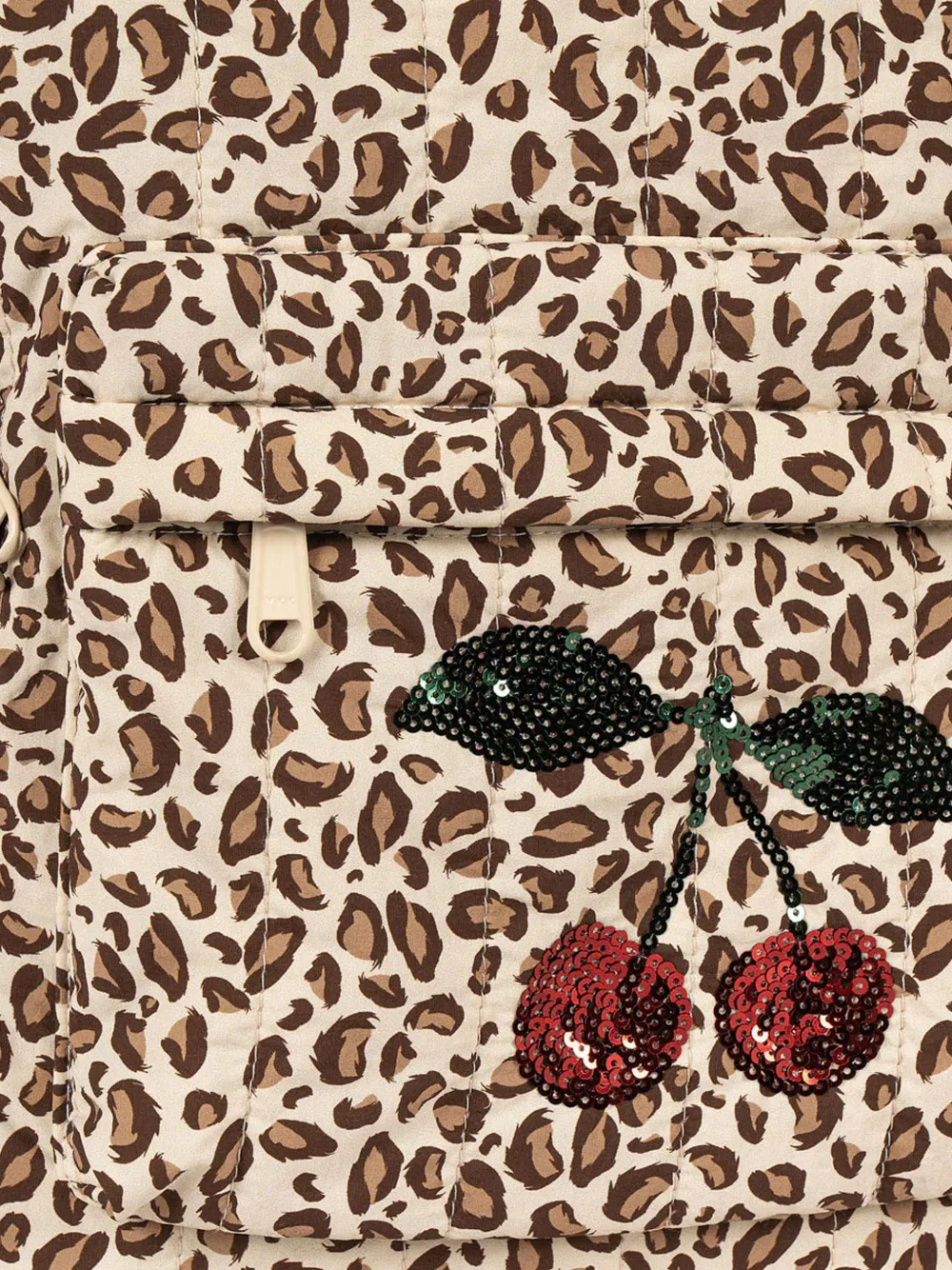 Бежевый топ с леопардовым принтом по всей поверхности, декором в виде вишен из пайеток, одной ручкой сверху, регулируемыми плечевыми ремнями, передним карманом на молнии и верхней застежкой-молнией