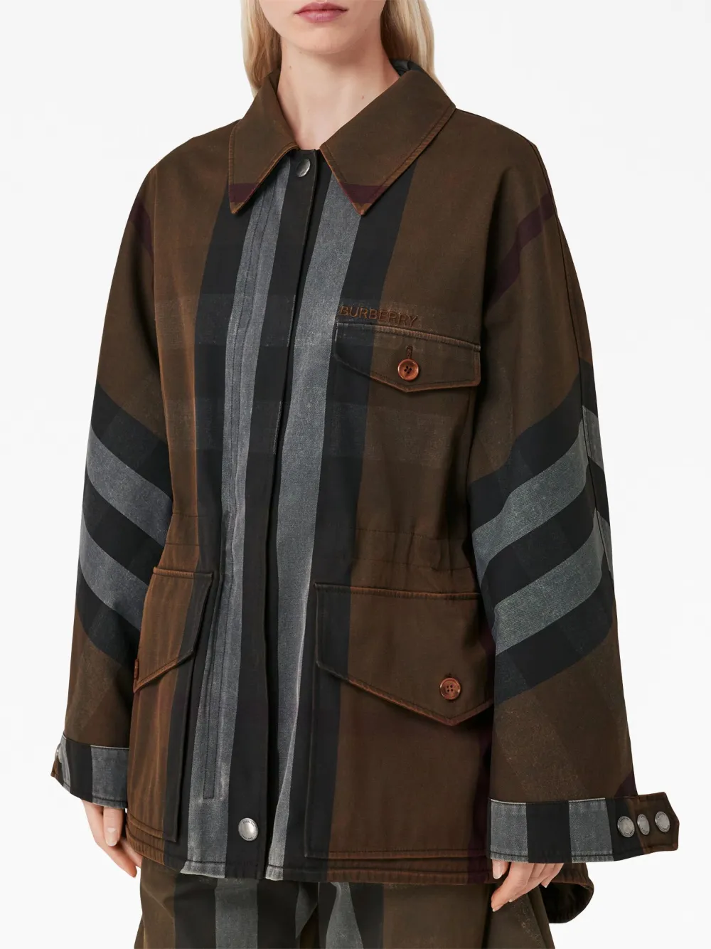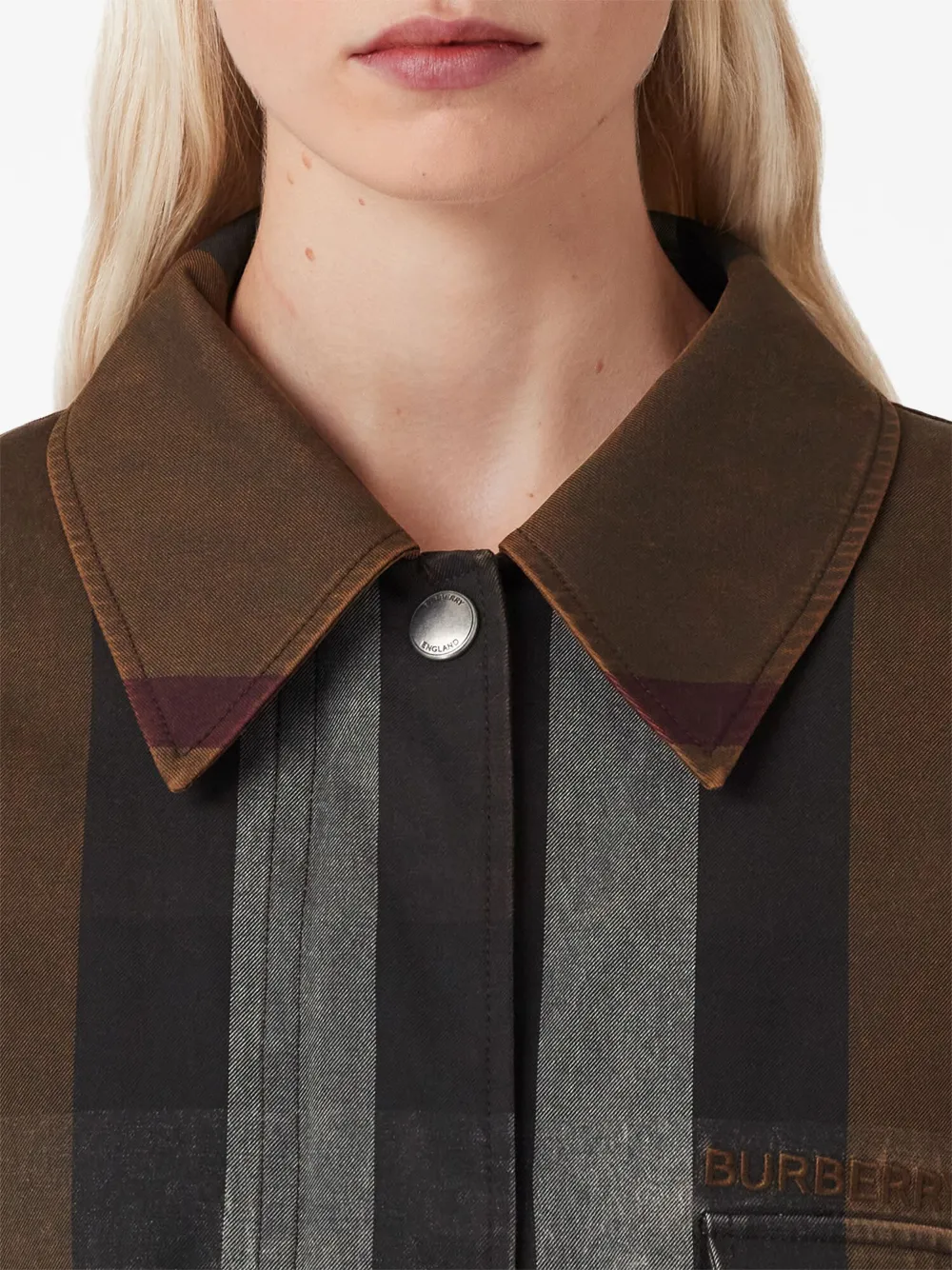 Расцветка Аnimalier Brown, клетчатый узор, вышитый логотип на груди, плоский заостренный воротник, потайная застежка спереди, длинные рукава, манжеты на пуговицах, эластичный пояс сзади, передние карманы с клапаном и неравномерный подол.