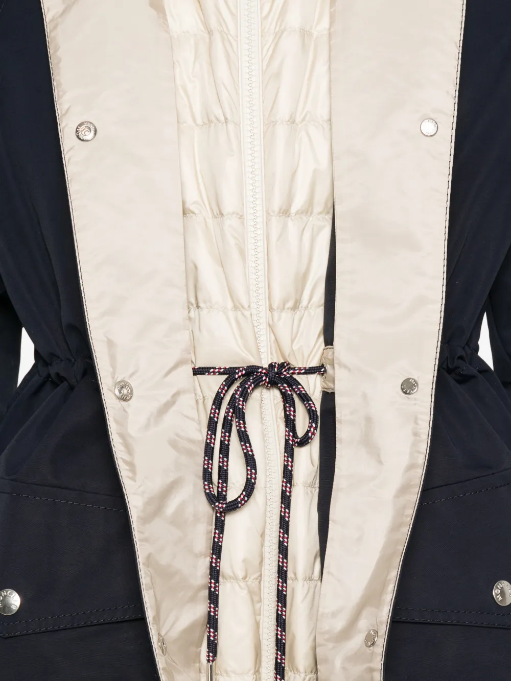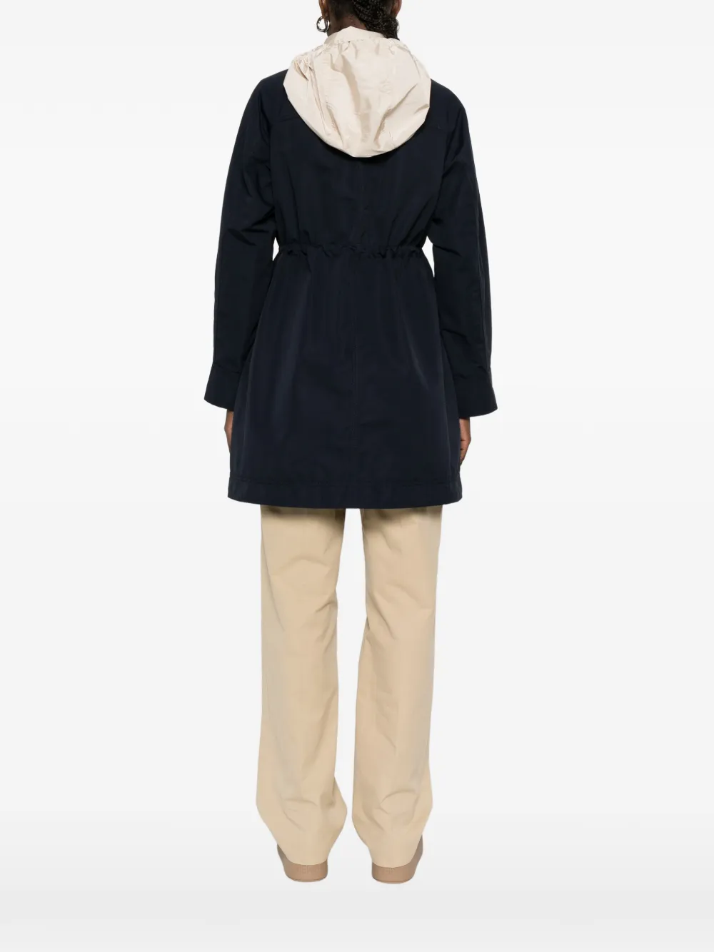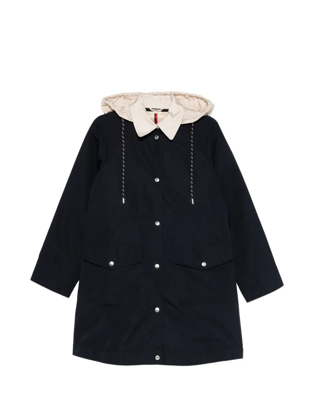 Темно-синяя, застежка на кнопки, капюшон на кулиске, накладные карманы спереди с клапанами, длинные рукава, прямой подол