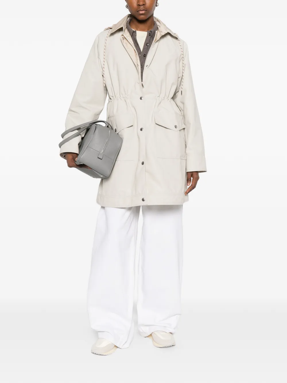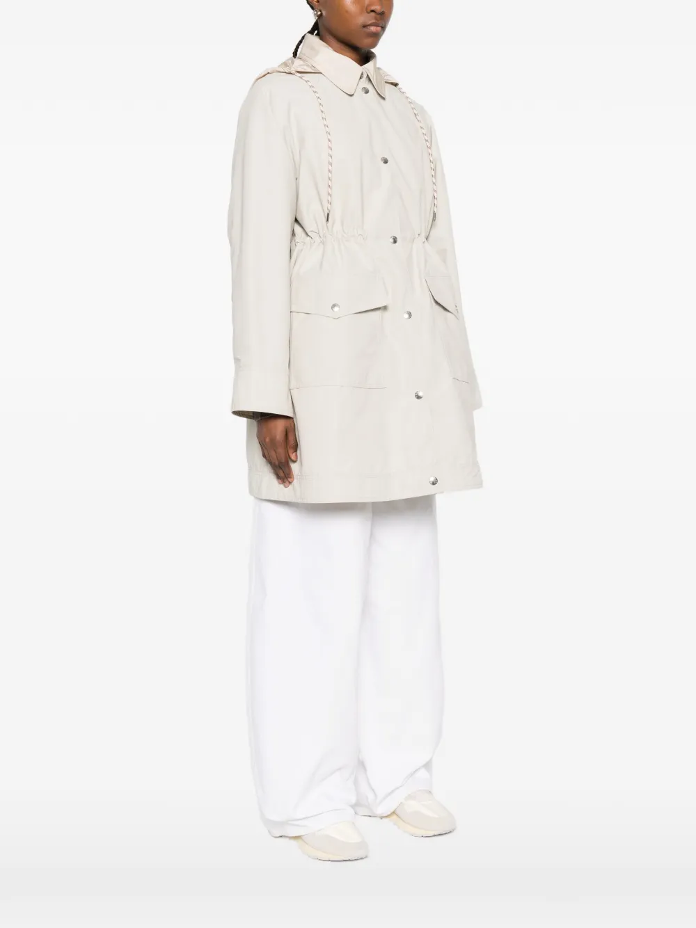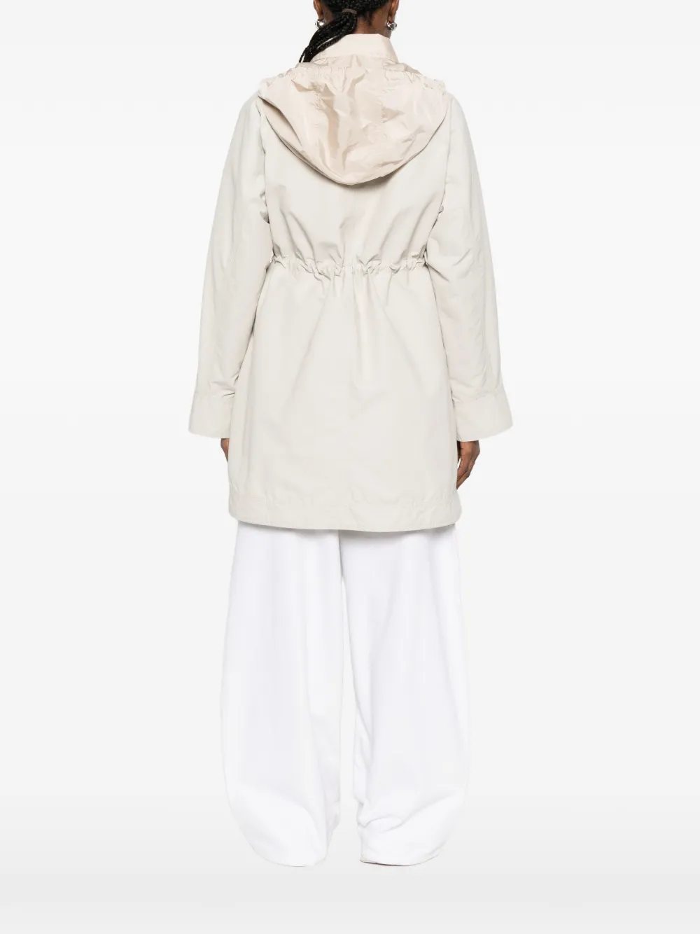 Светло-бежевый, съемный капюшон, накладные карманы спереди, фиксирующийся на шнурке пояс, съемная подкладка