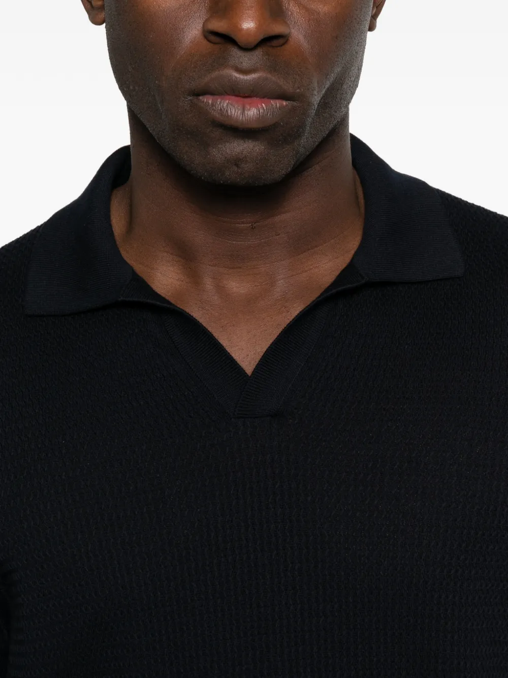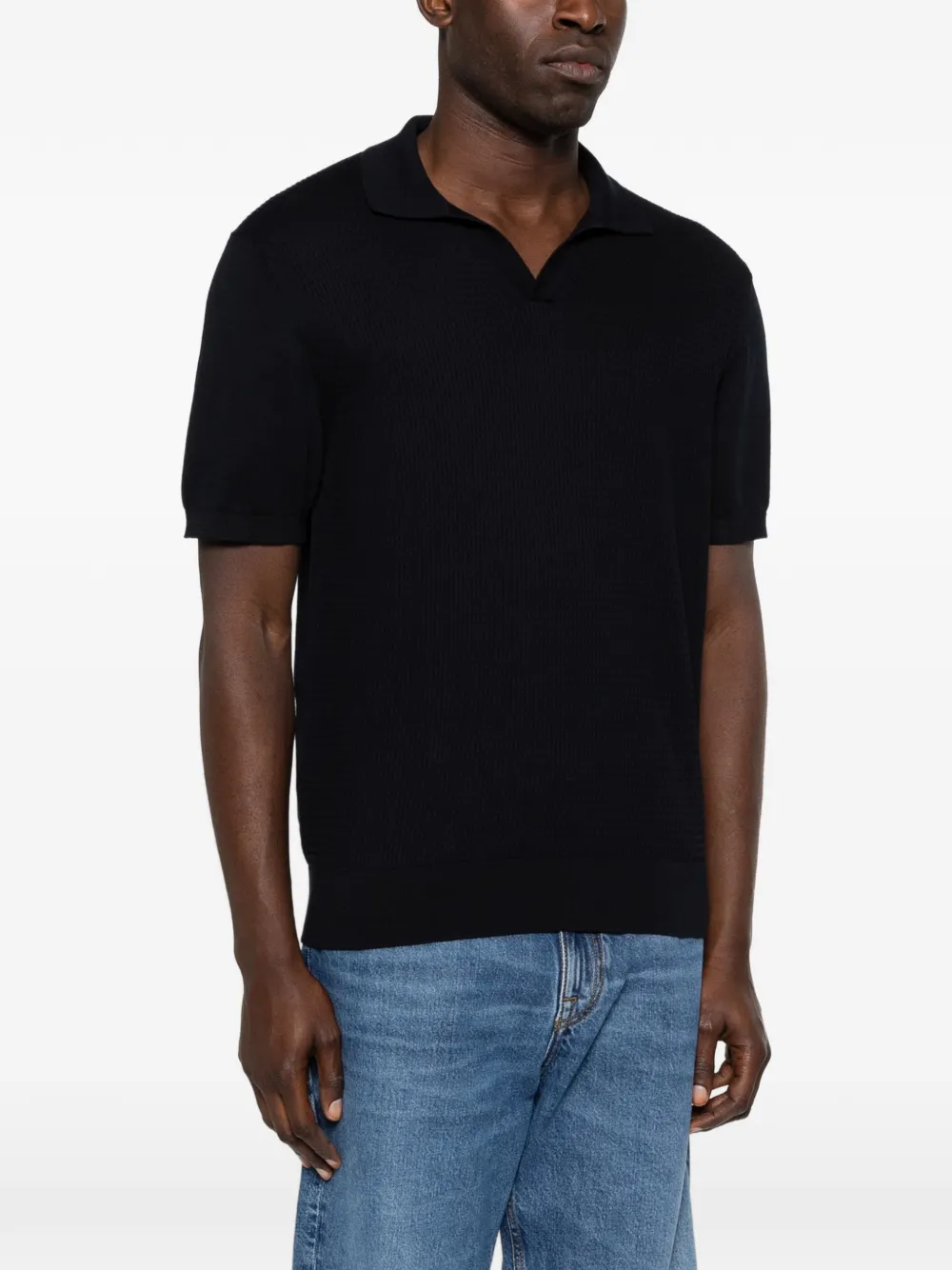 Темно-синий фактурный трикотаж с V-образным вырезом и короткими рукавами
