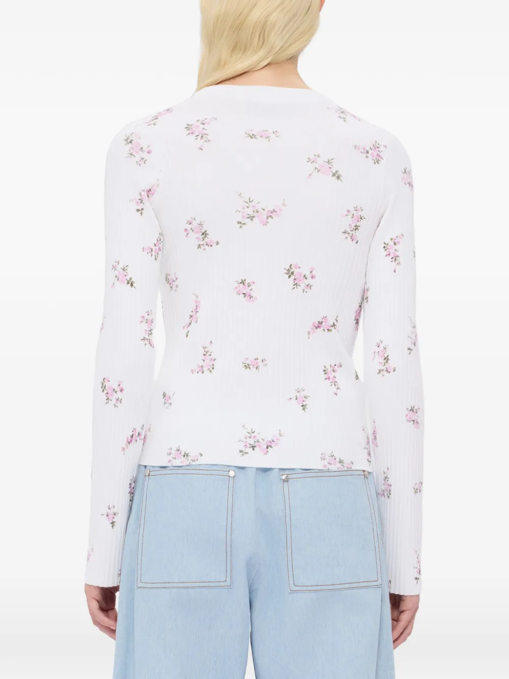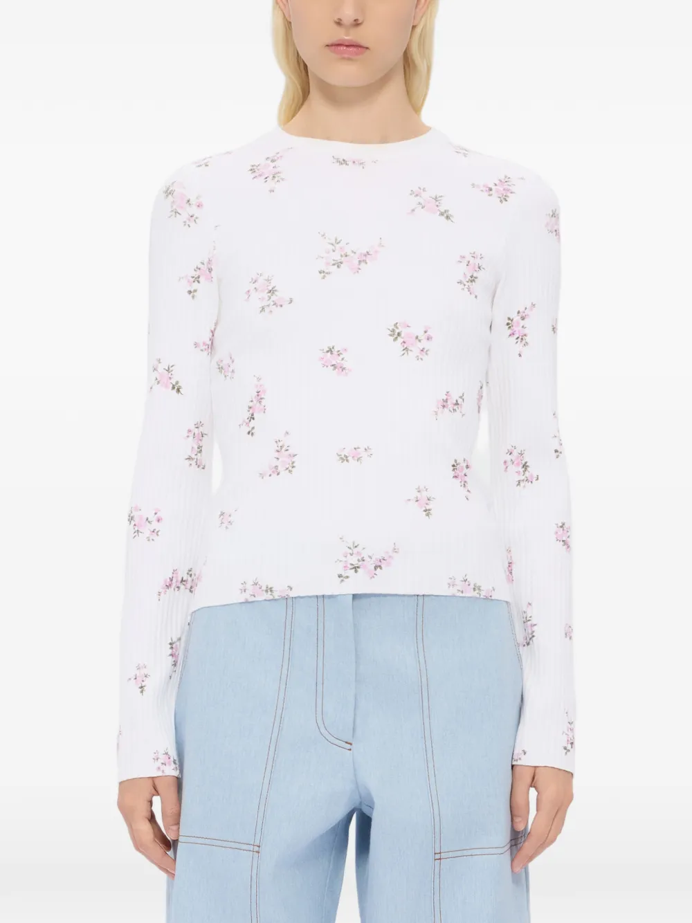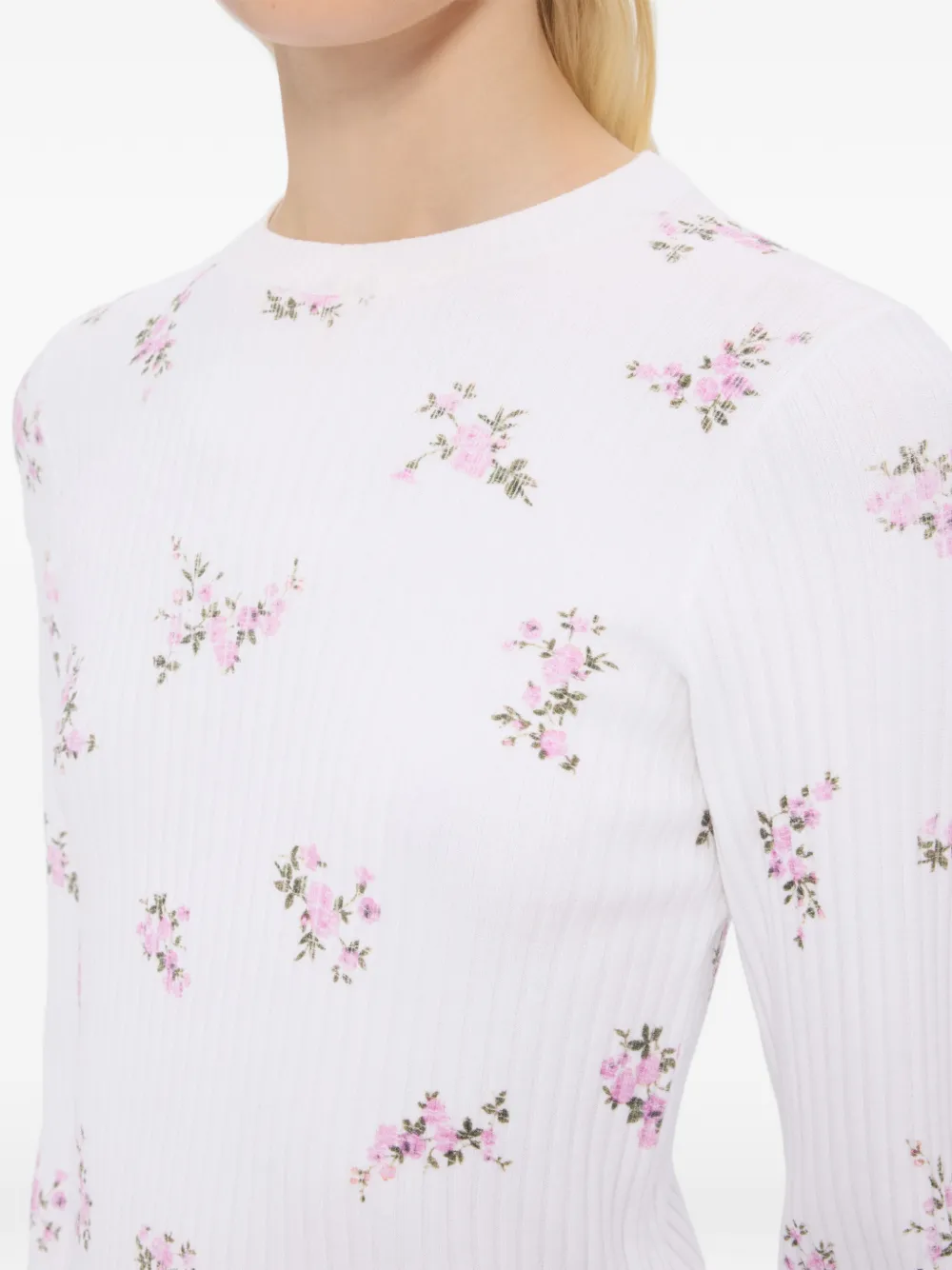 Белый вязаный топ в рубчик с цветочным принтом, круглым вырезом и длинными рукавами