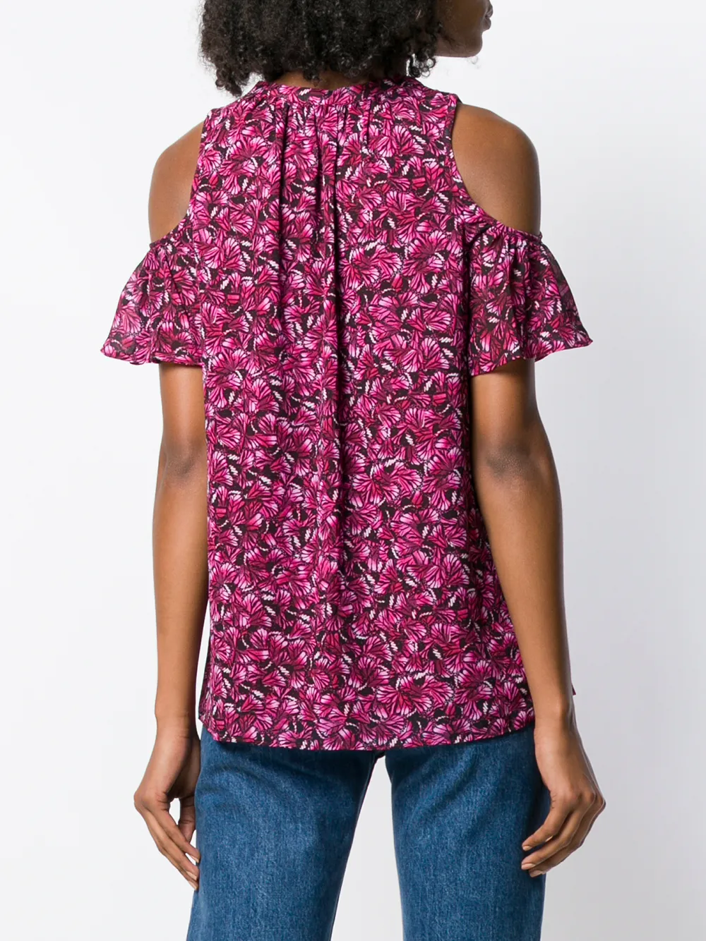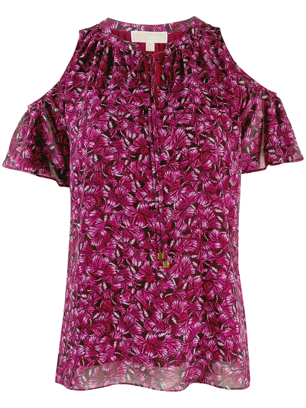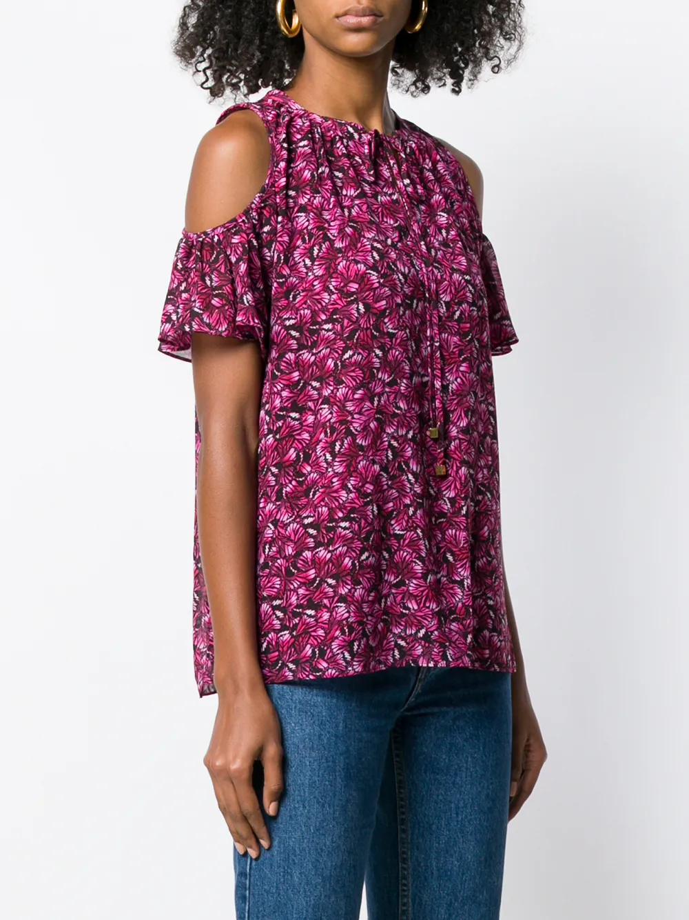 Топ с открытыми плечами и принтом от Michael Michael Kors (Майкл Майкл Корс). Короткие свободные рукава и горловина на ленточной завязке.