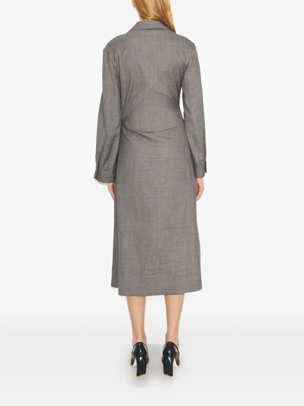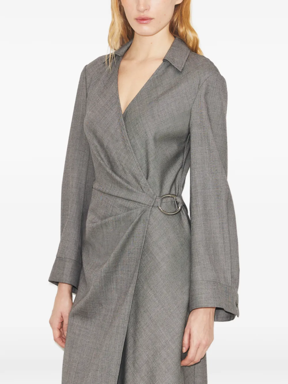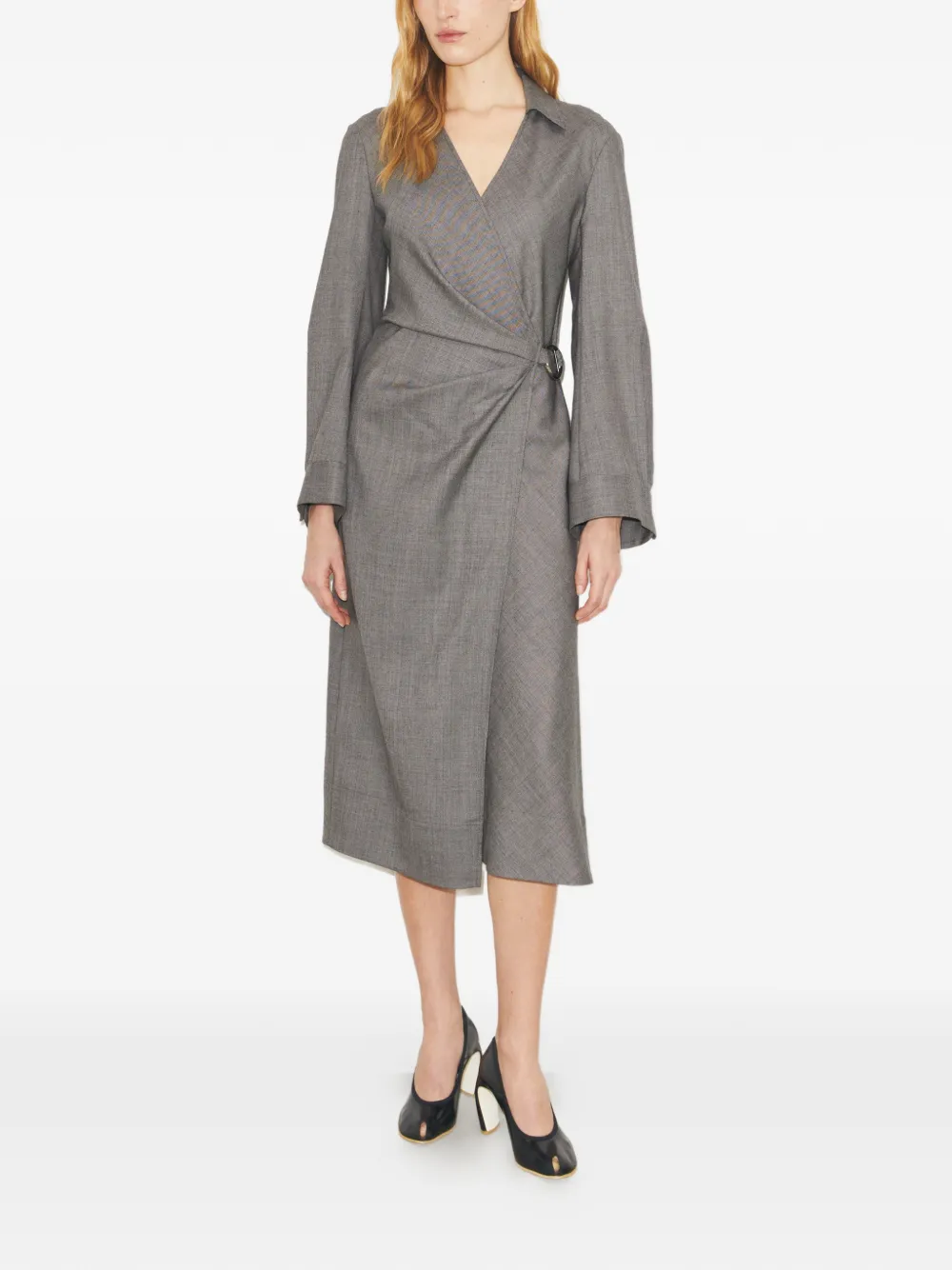 Женственный силуэт из классической шерстяной ткани. Платье-халат застегивается на пряжку на талии, создавая мягкие сборки. Острый воротник и глубокий V-образный вырез легко сочетаются с жакетами и свитерами этого сезона. Застежка на пряжку с левой стороны, пуговица на внутренней стороне платья и на манжетах рукавов. Длина: 125,7 см; длина рукава: 82,7 см (указано для размера 2). Средняя длина до середины икры. Ткань, произведенная в Японии. Черно-серый цвет, длинные рукава, тональная отделка строчкой.