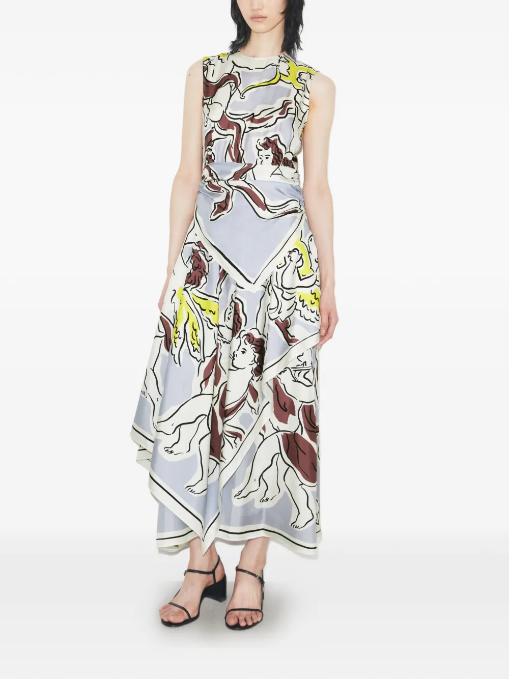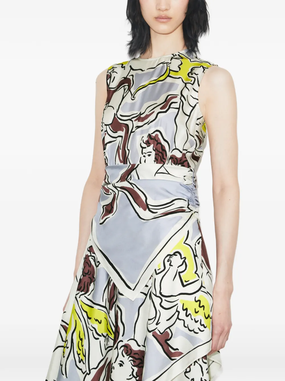 Изготовлено из шелкового твила с мягким драпирующимся силуэтом, платье без рукавов выполнено с асимметричными слоями, напоминающими шарф. Рисунок с вручную нарисованными амурами вдохновлен живописью эпохи Ренессанса. Скрытая задняя молния с застежкой на крючок и петлю. Длина: 136 см (размер 2), выше щиколотки. Лиловый цвет, асимметричный подол.
