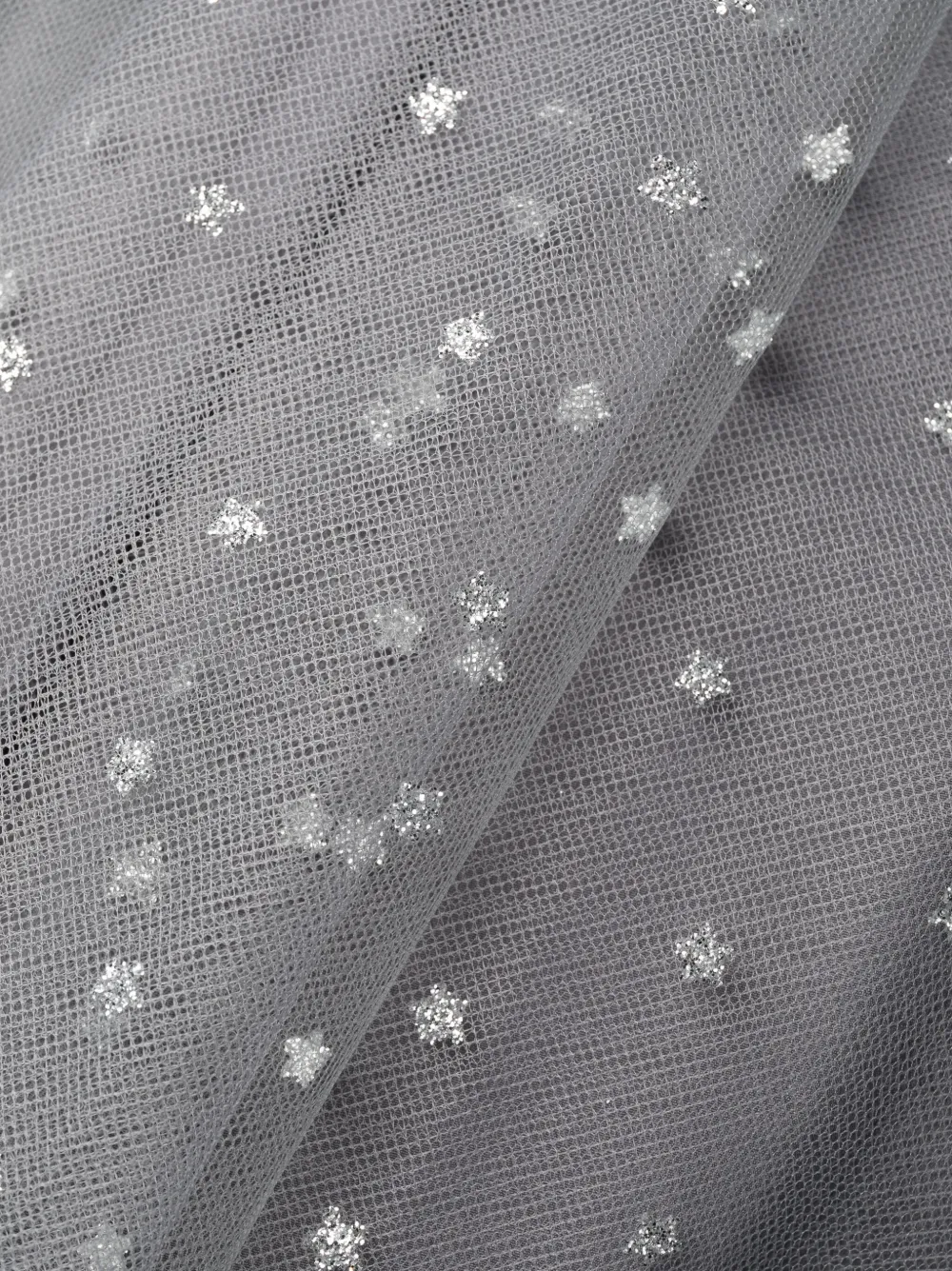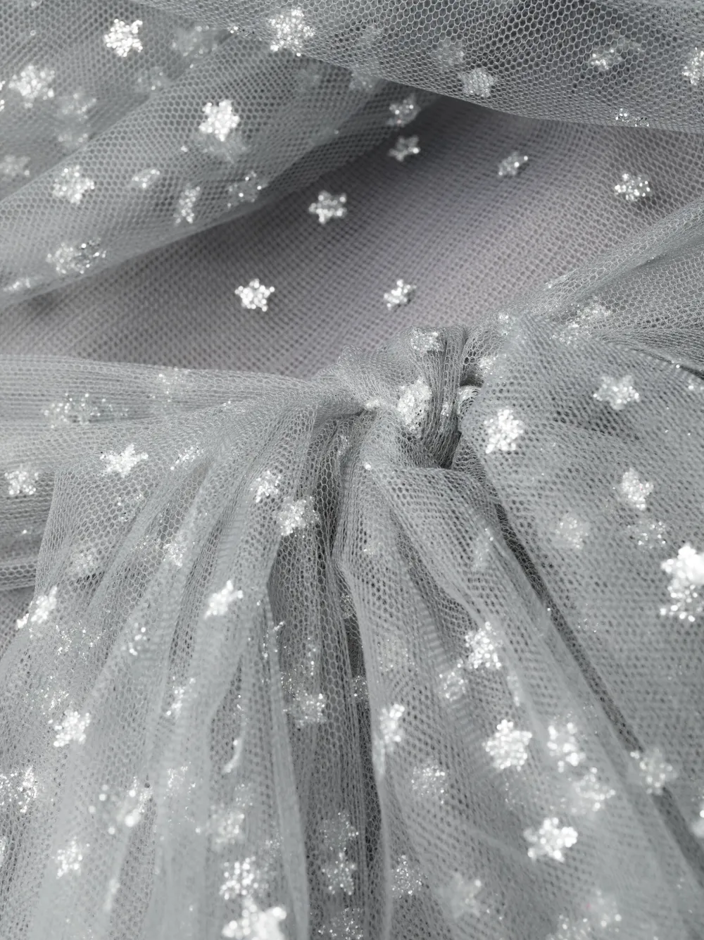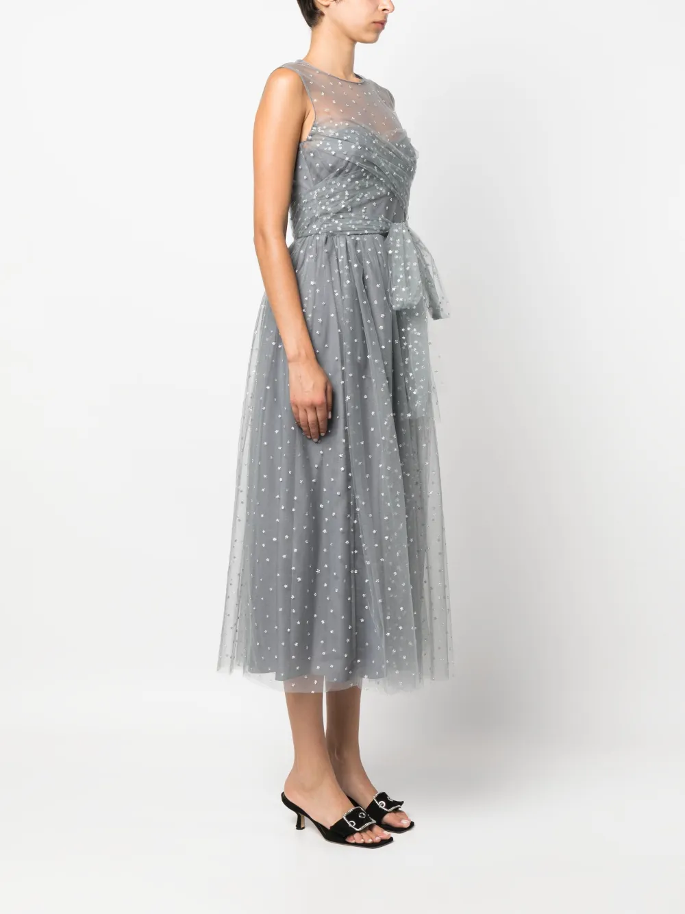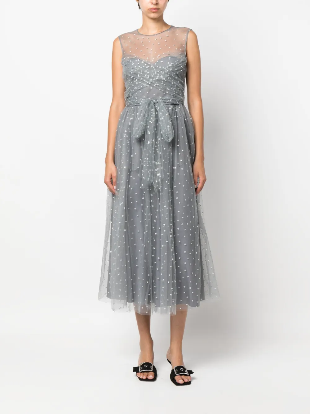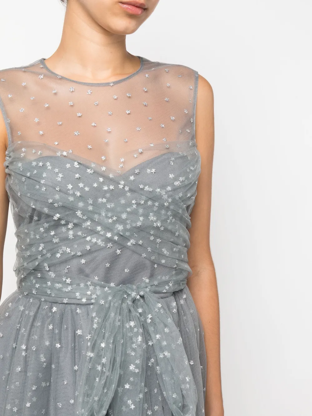 Серый, верхний слой из тюля, блестящий материал, завязки спереди, застежка на молнии сзади, круглый вырез, без рукавов, длина миди и расклешенный подол.