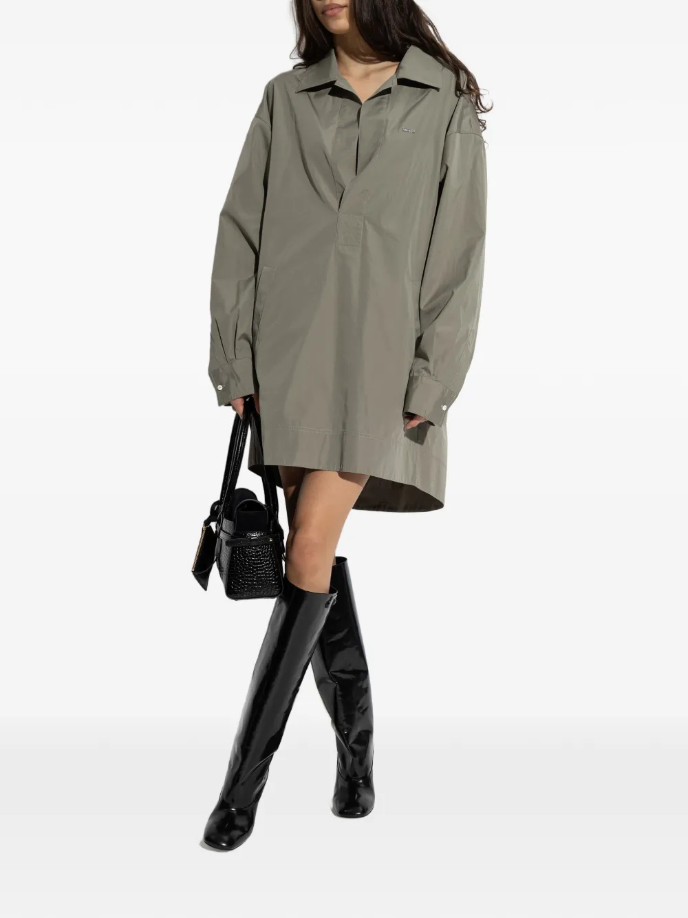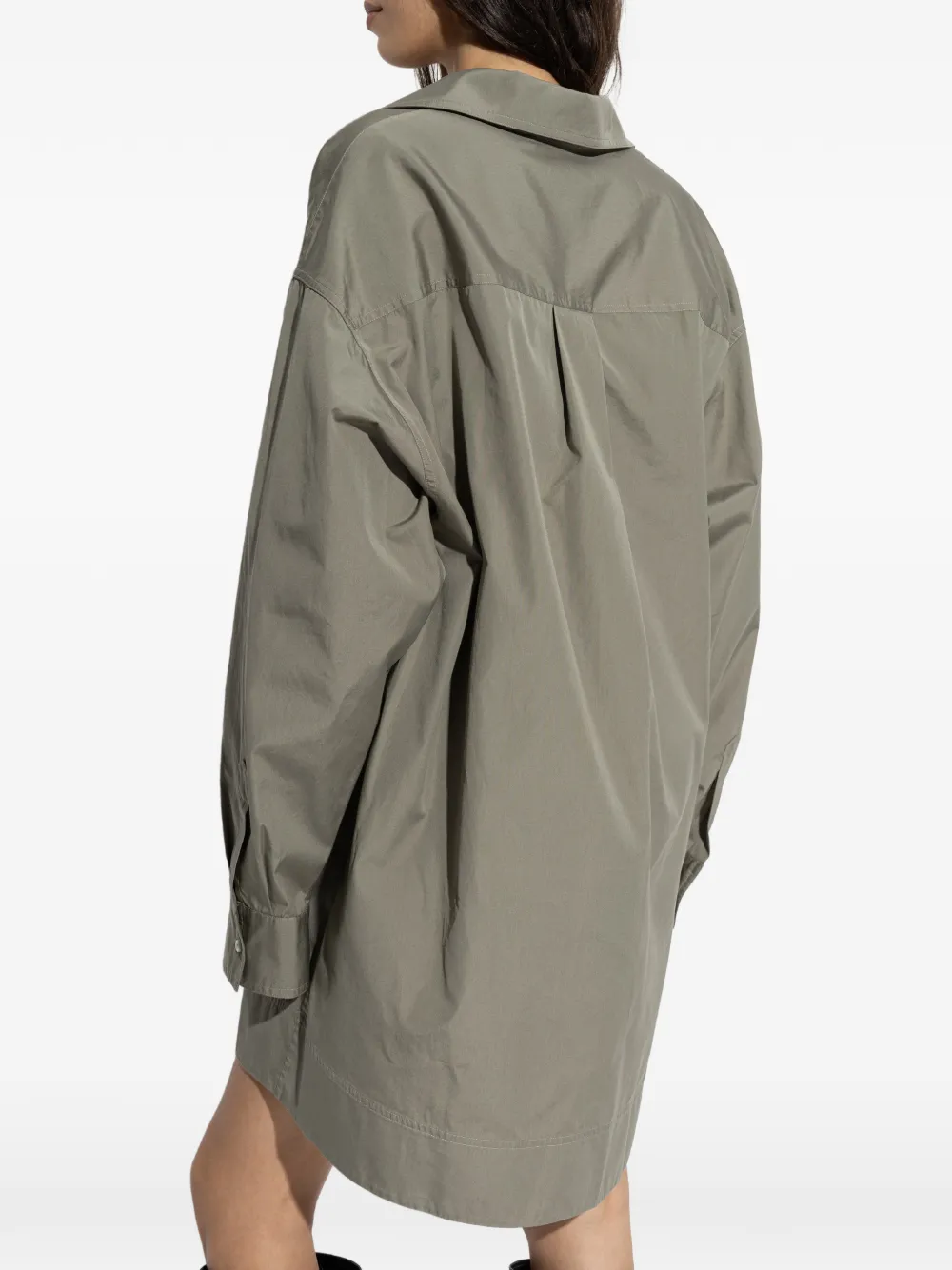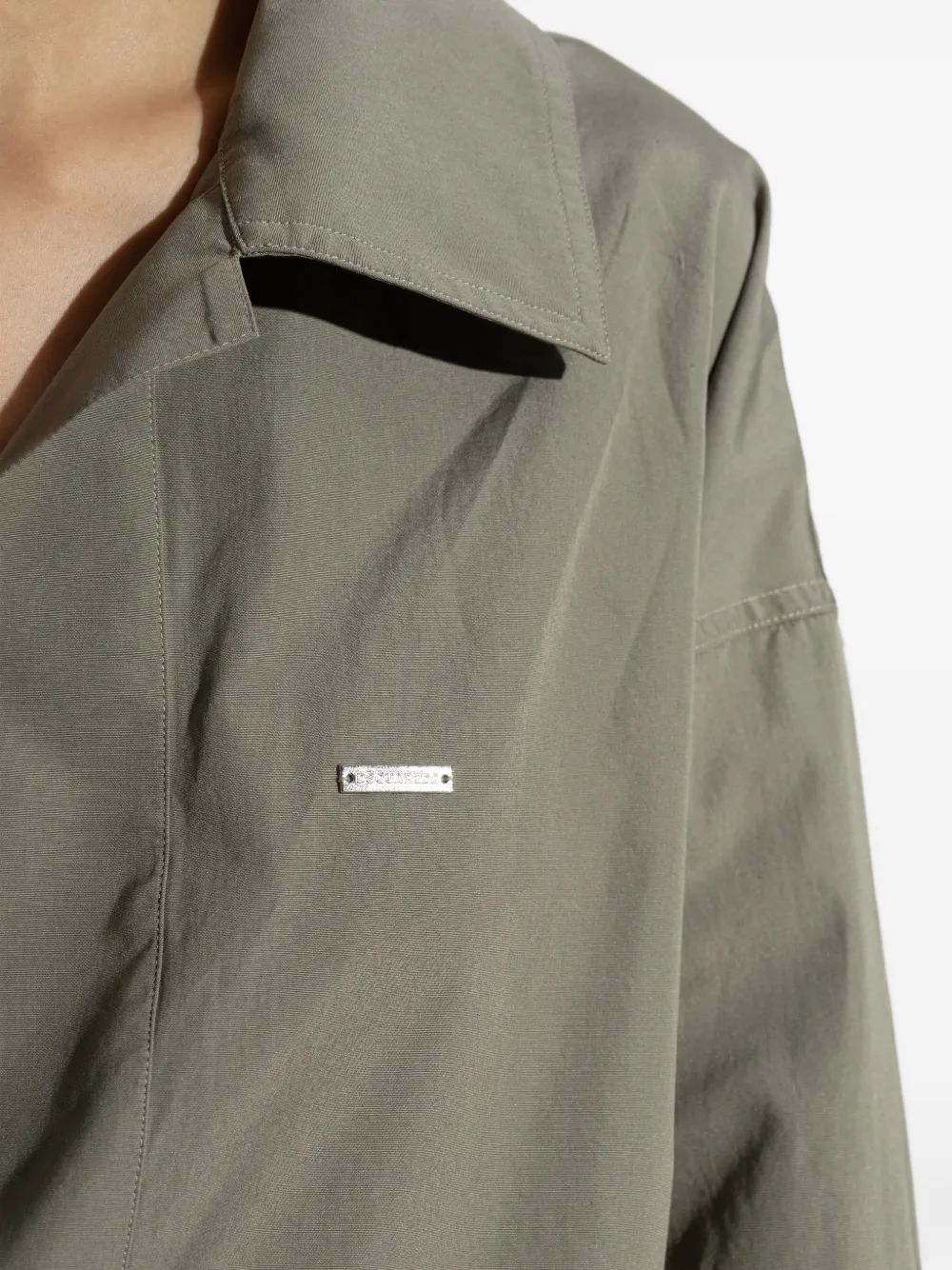 Оливково-зеленый цвет, воротник-стойка с крыльями, длинные рукава, застежка на пуговицы на манжетах, нашивка с логотипом, удлиненный низ