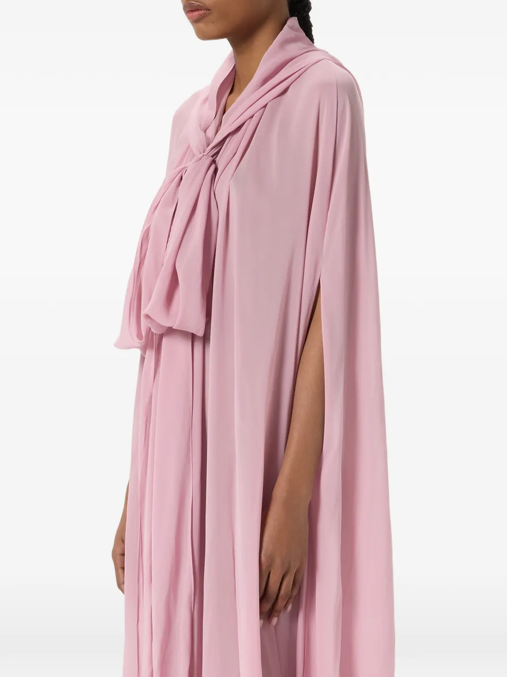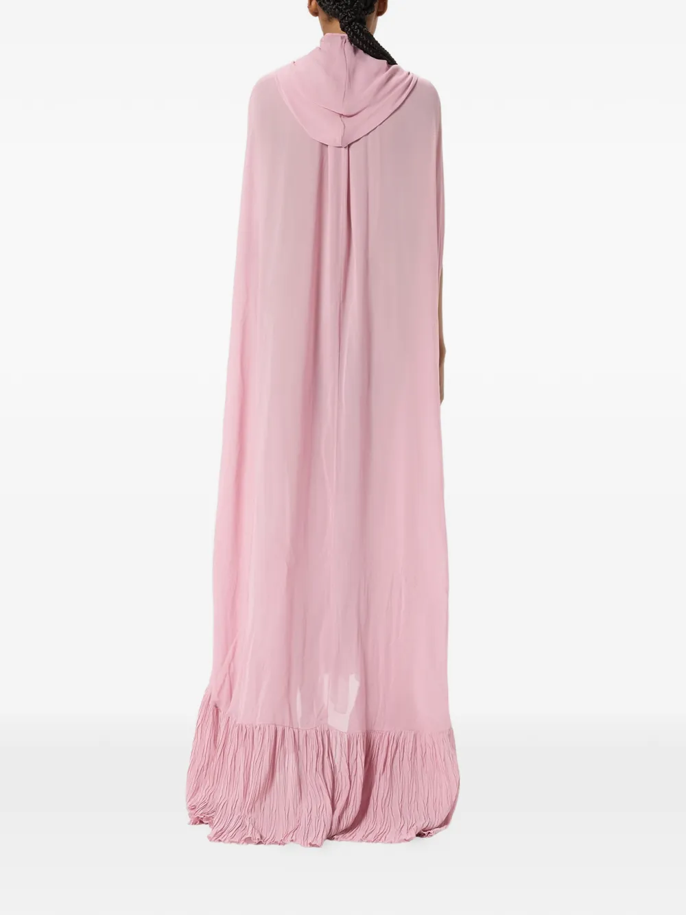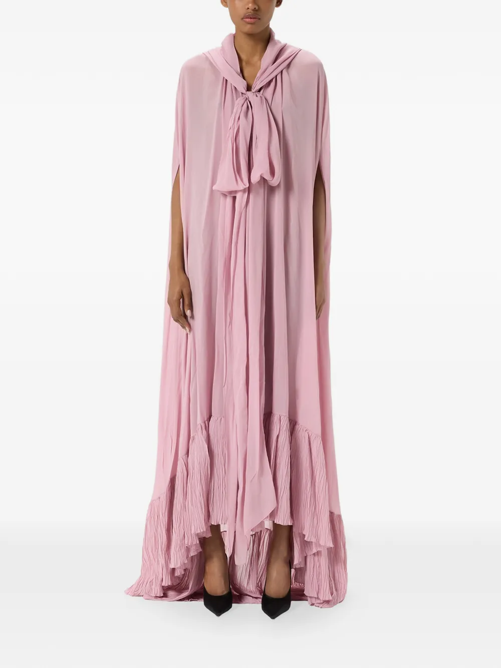 Розовая модель из креп-шифона с капюшоном, разрезами на рукавах, отделкой в виде банта на воротнике, сборками и оборчатым подолом