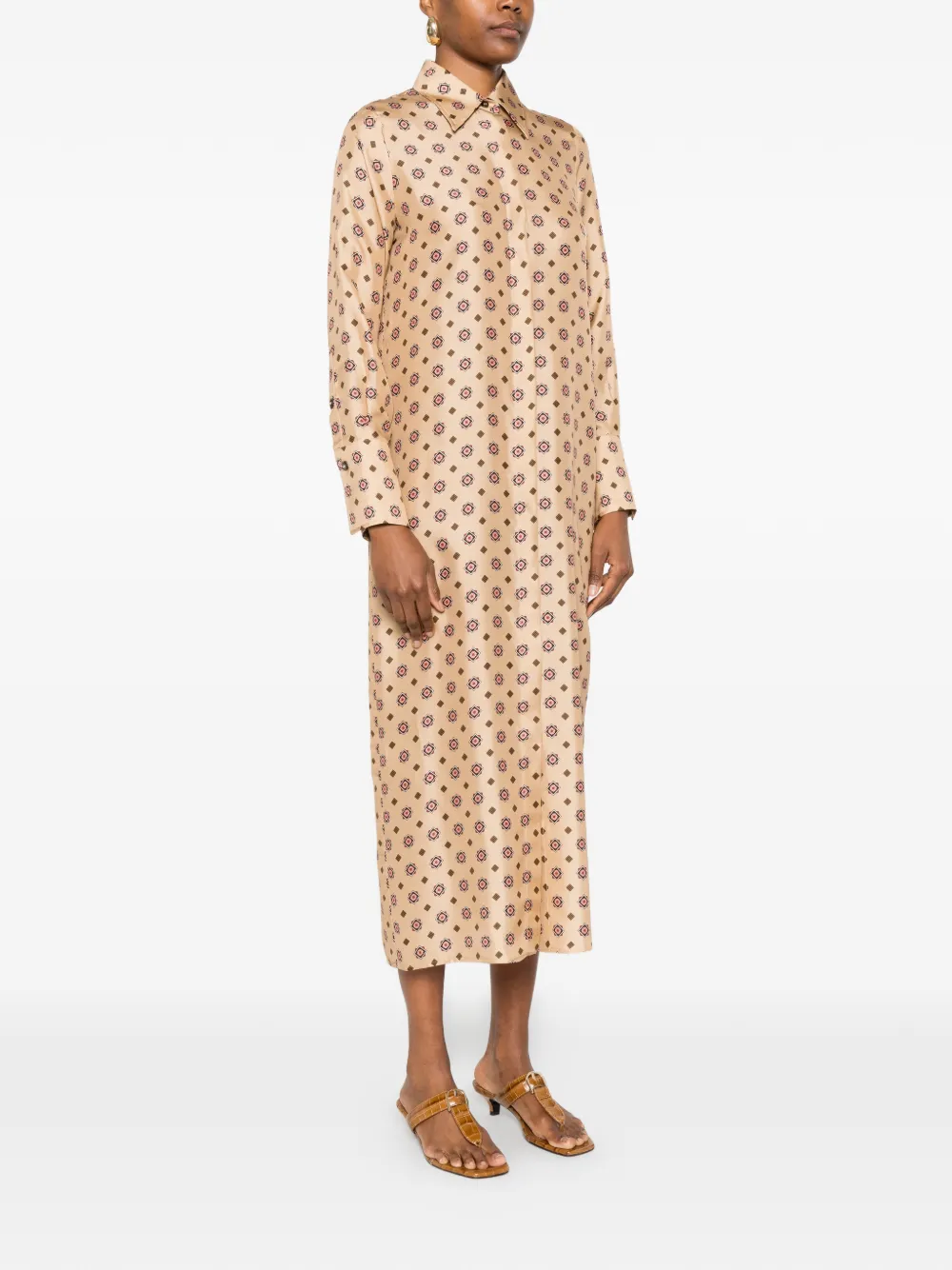 Бежевое рубашка с принтом по всей поверхности, длинными рукавами, застежкой на пуговицах, отложным воротником, свободного кроя