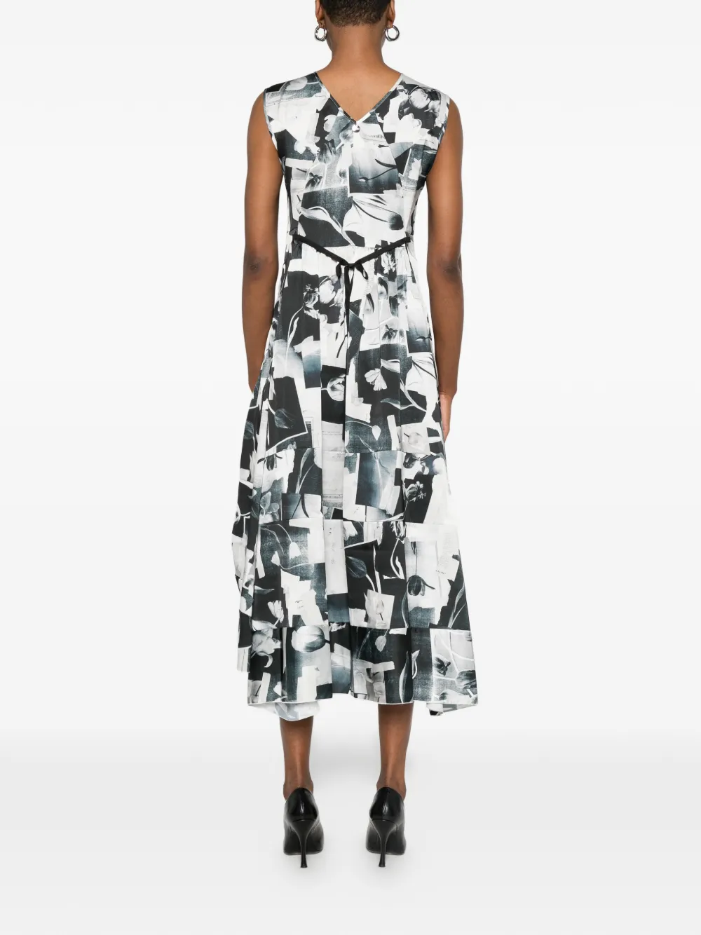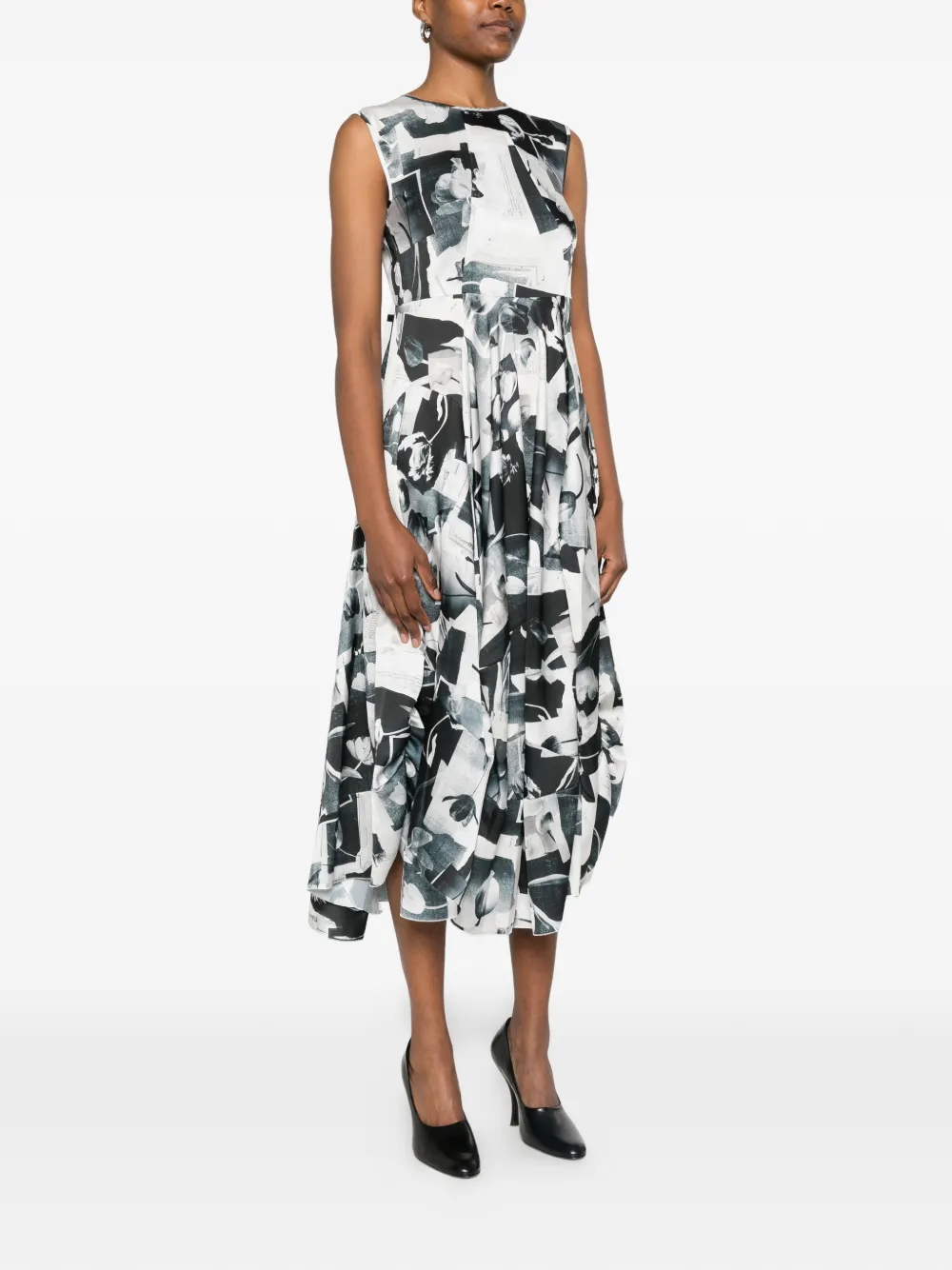 Белое и черное платье без рукавов с графичным принтом, круглым вырезом, присборенными деталями и плиссированным дизайном