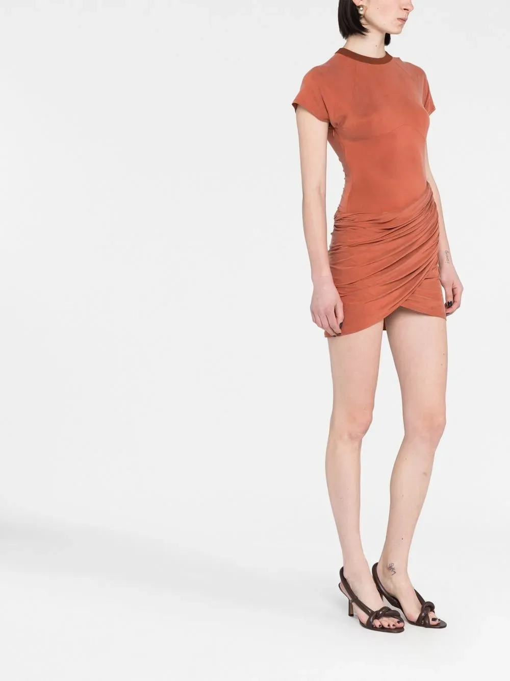 Оранжевый, стрейчевая ткань, круглый вырез, короткие рукава реглан, вырезные детали, драпировка и асимметричный подол.