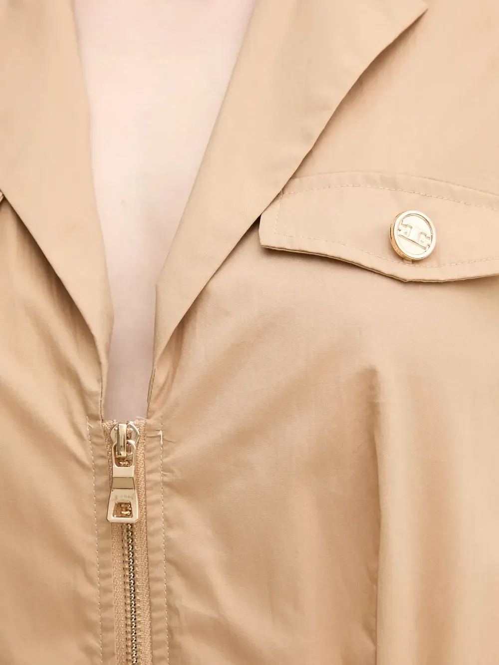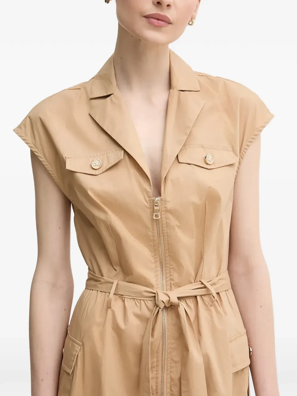 Бежевый жилет без рукавов с застежкой-молнией спереди, отложным воротником, накладными карманами с клапанами и поясом