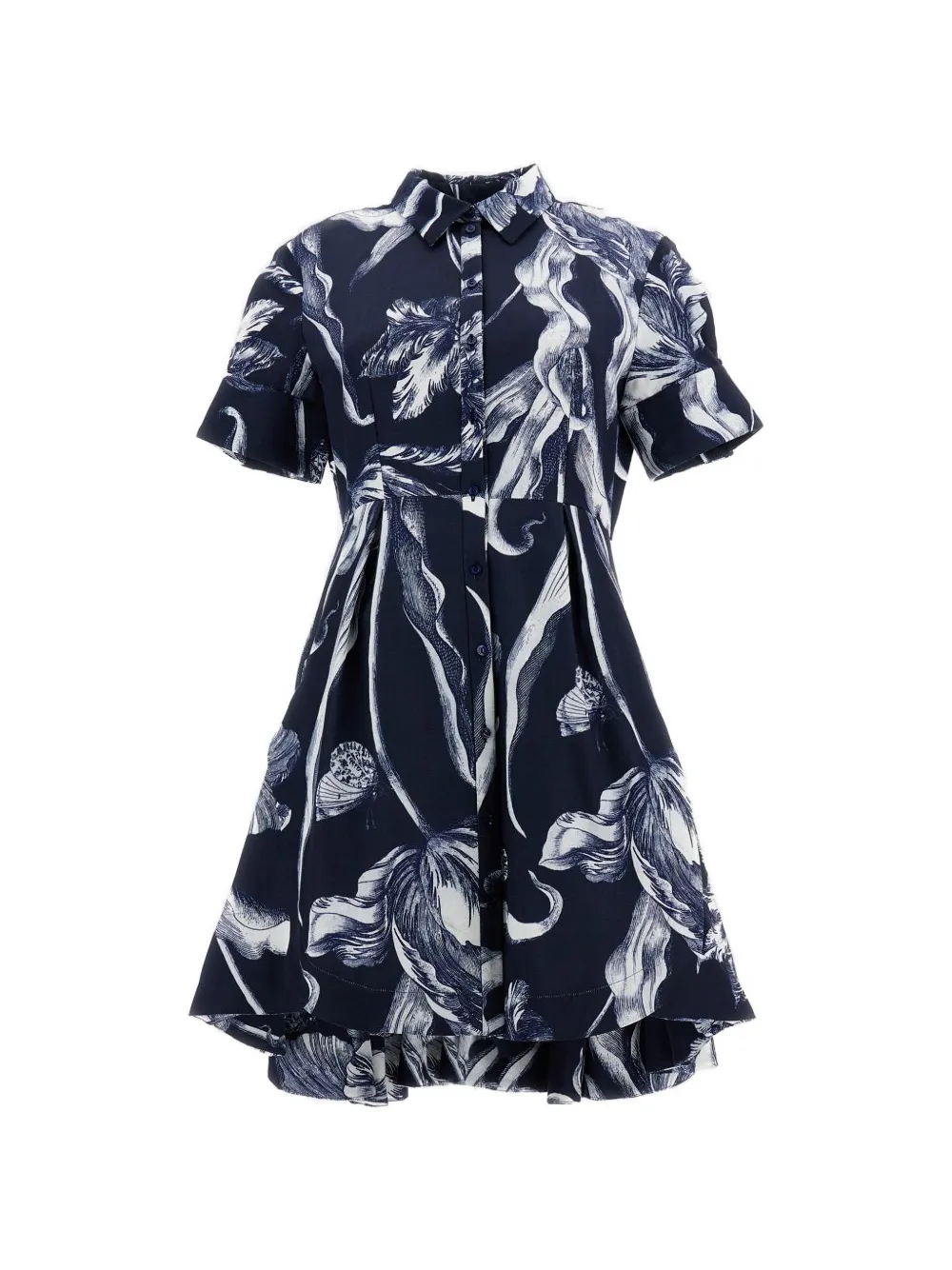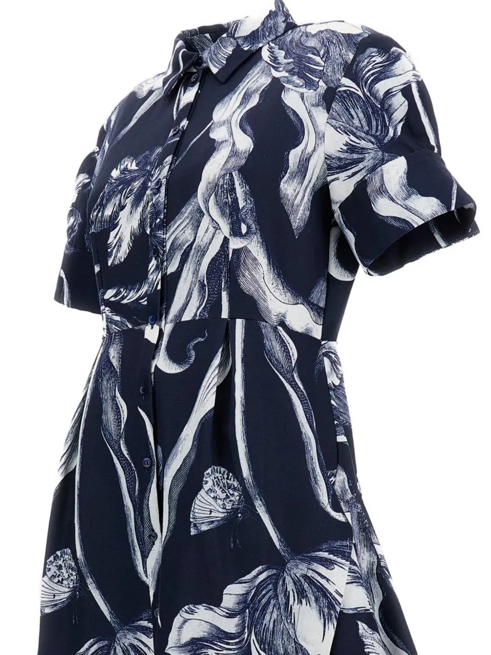 Синее платье с цветочным принтом, отложным воротником, короткими рукавами, застежкой-молнией и юбкой А-силуэта